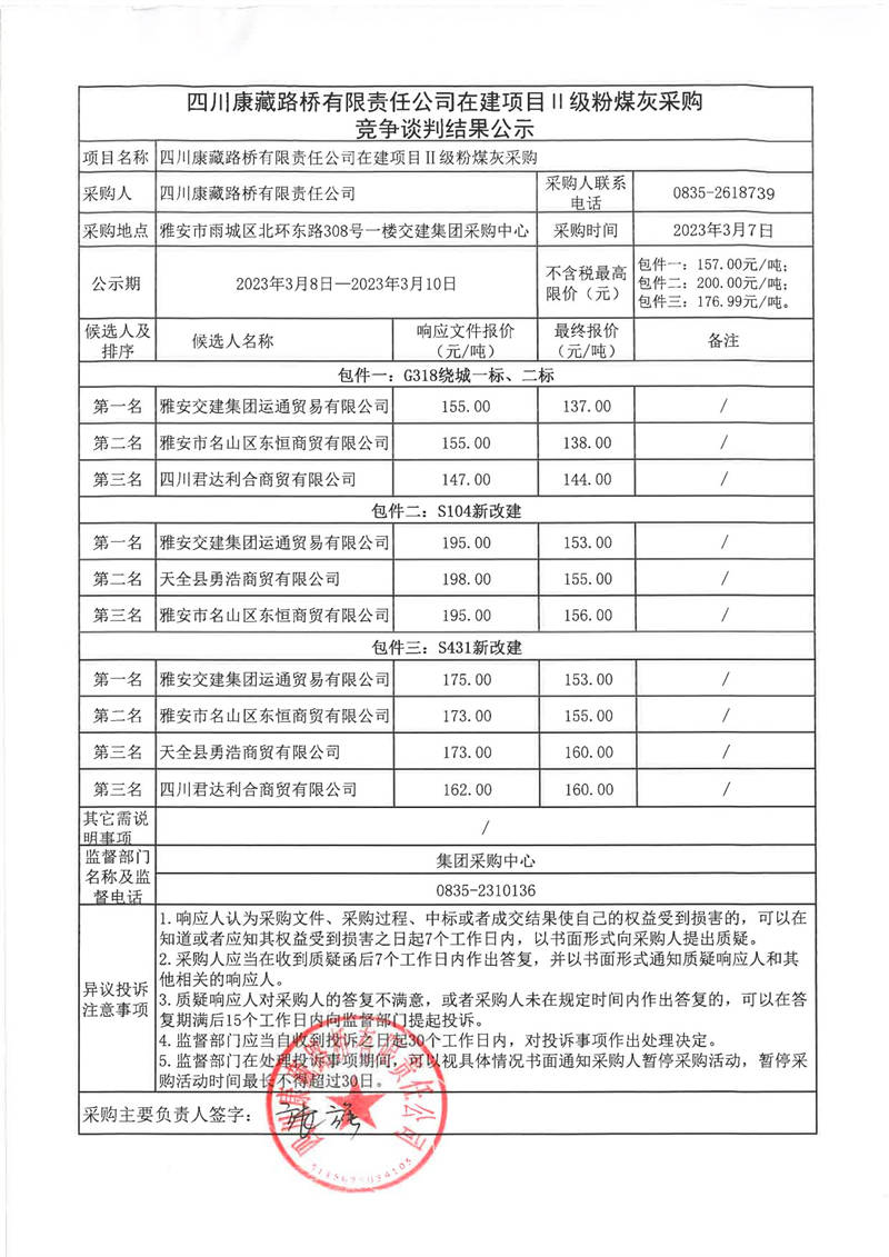 四川康藏路橋有限責任公司在建項目II級粉煤灰采購競爭談判結(jié)果公示