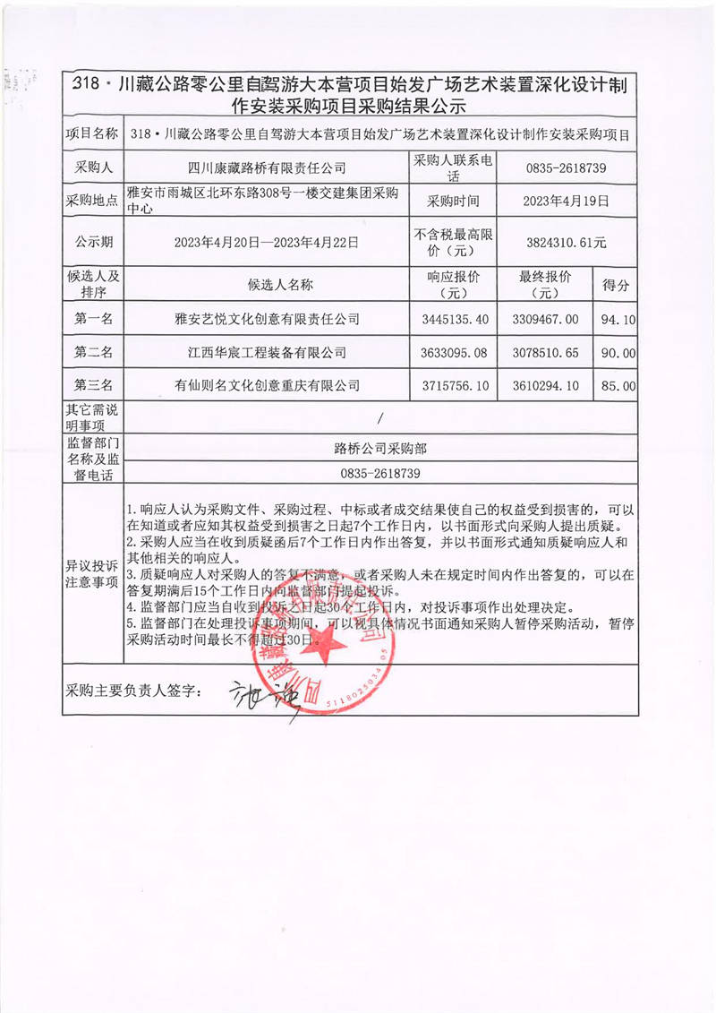 四川康藏路橋有限責任公司318·川藏公路零公里自駕游大本營項目始發(fā)廣場藝術裝置深化設計制作安裝采購項目采購結果公示