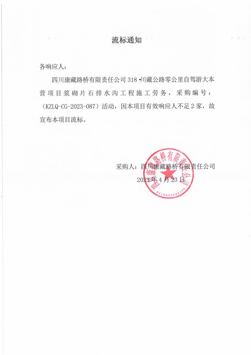四川康藏路橋有限責(zé)任公司318·川藏公路零公里自駕游大本營(yíng)項(xiàng)目漿砌片石排水溝工程施工勞務(wù)流標(biāo)通知