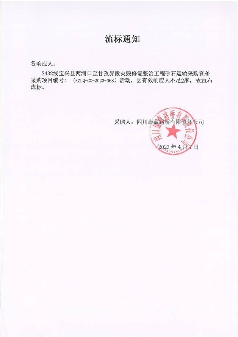 四川康藏路橋有限責(zé)任公司寶興分公司S432寶興縣兩河口至甘孜界段災(zāi)毀修復(fù)整治工程砂石運輸采購流標通知