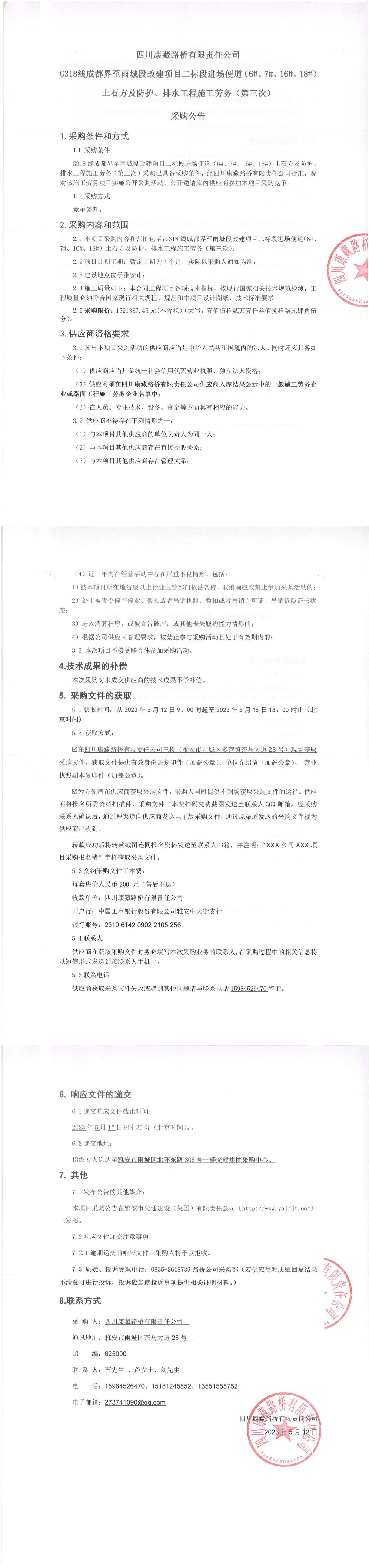 四川康藏路橋有限責(zé)任公司G318線成都至雨城段改建項(xiàng)目二標(biāo)段進(jìn)場便道(6#、7#、16#、18#)土石方及防護(hù)、排水工程施工勞務(wù)(第三次)采購公告
