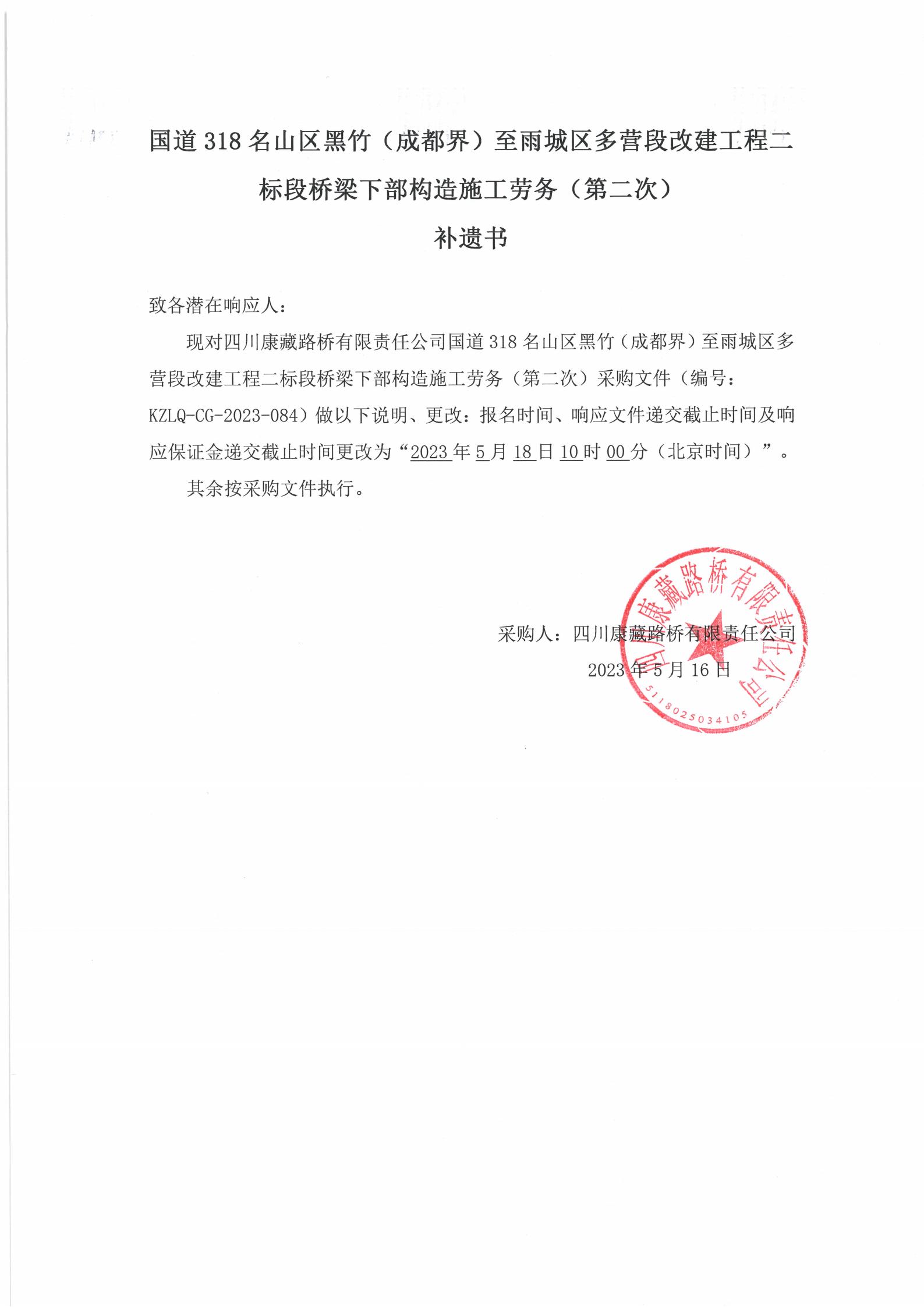 四川康藏路橋有限責(zé)任公司國道318名山區(qū)黑竹(成都界)至雨城區(qū)多營段改建工程二標(biāo)段橋梁下部構(gòu)造施工勞務(wù)(第二次)補遺書