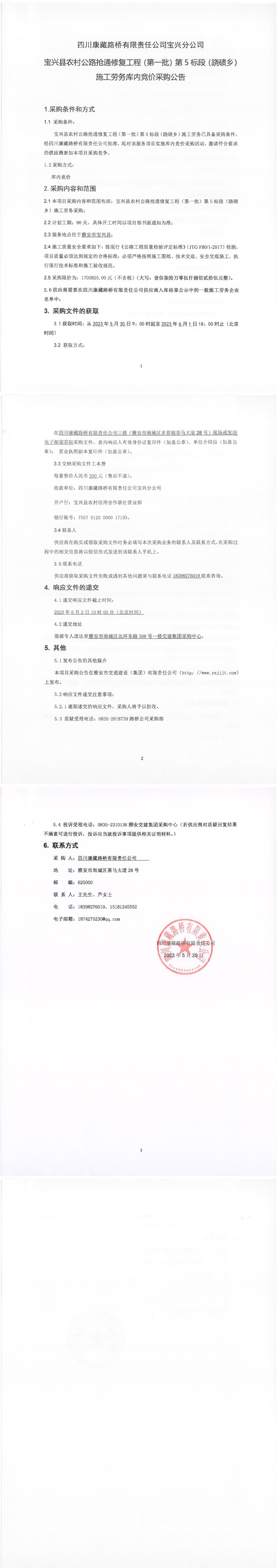 四川康藏路橋有限責任公司寶興農村公路搶通修復工程(第一批)第5標段(蹺磧鄉(xiāng))施工勞務庫內競價采購公告