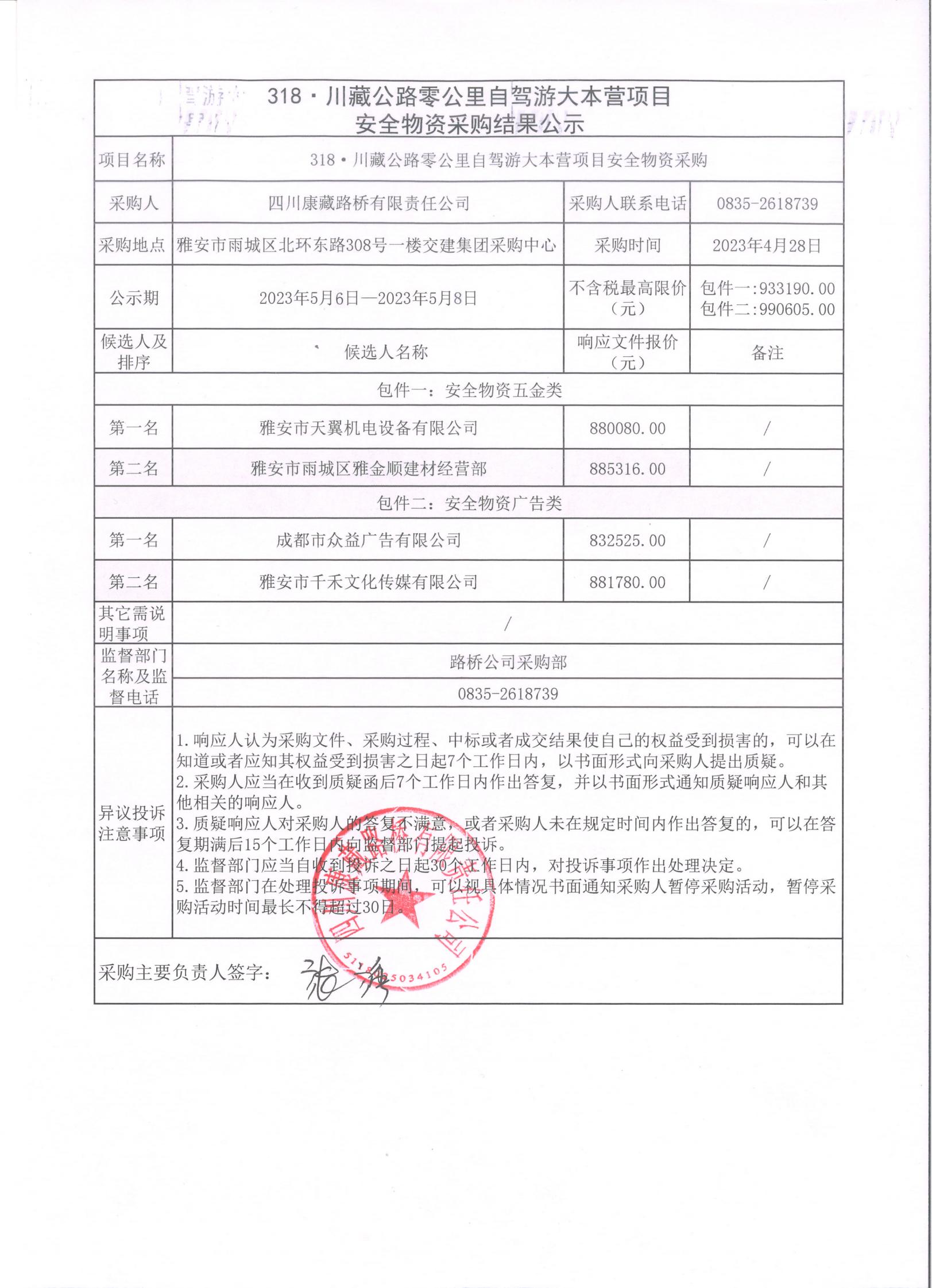 四川康藏路橋有限責(zé)任公司318·川藏公路零公里自駕游大本營(yíng)項(xiàng)目安全物資采購(gòu)結(jié)果公示