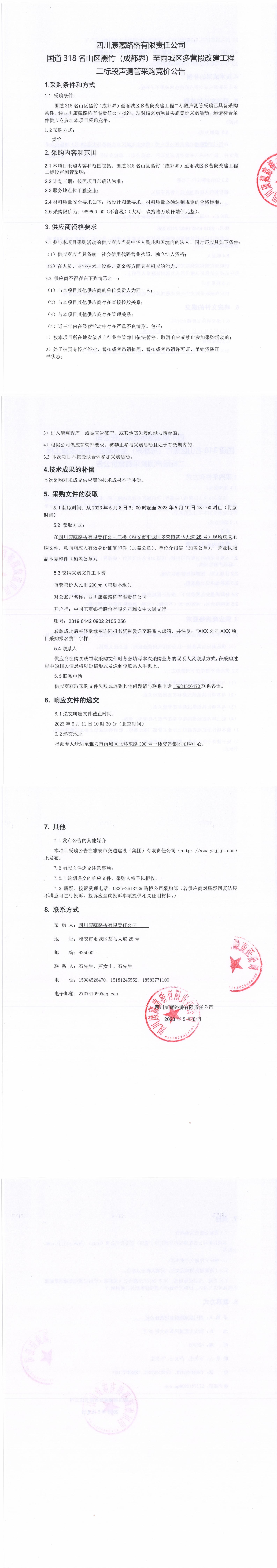 四川康藏路橋有限責(zé)任公司國道318名山區(qū)黑竹(成都界)至雨城區(qū)多營段改建工程二標(biāo)段聲測管采購競價(jià)公告