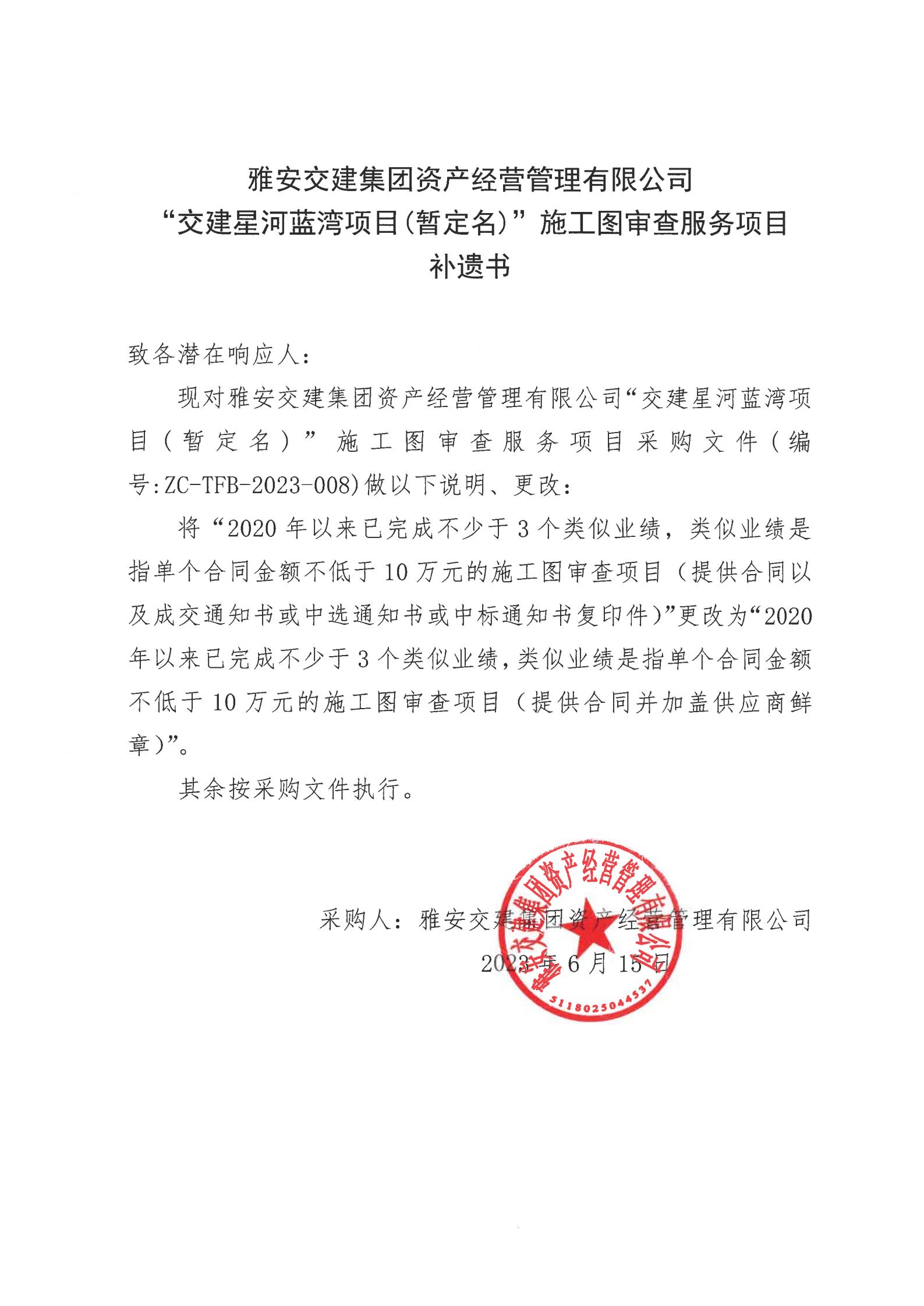 雅安交建集團(tuán)資產(chǎn)經(jīng)營管理有限公司“交建星河藍(lán)灣項(xiàng)目(暫定名)”施工圖審查服務(wù)項(xiàng)目采購補(bǔ)遺書