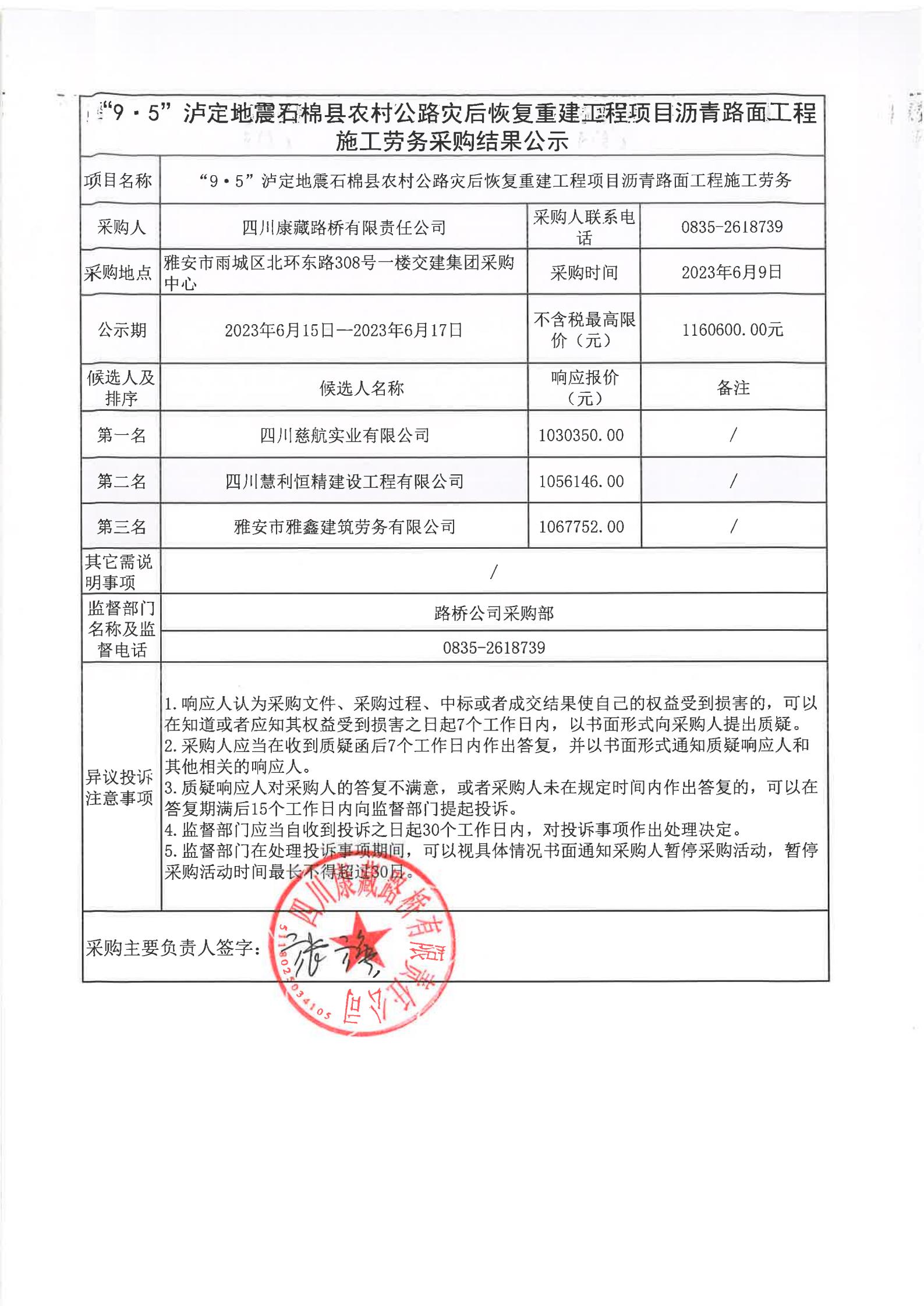 四川康藏路橋有限責(zé)任公司“9·5”瀘定地震石棉縣農(nóng)村公路災(zāi)后恢復(fù)重建工程項(xiàng)目瀝青路面工程施工勞務(wù)采購結(jié)果公示