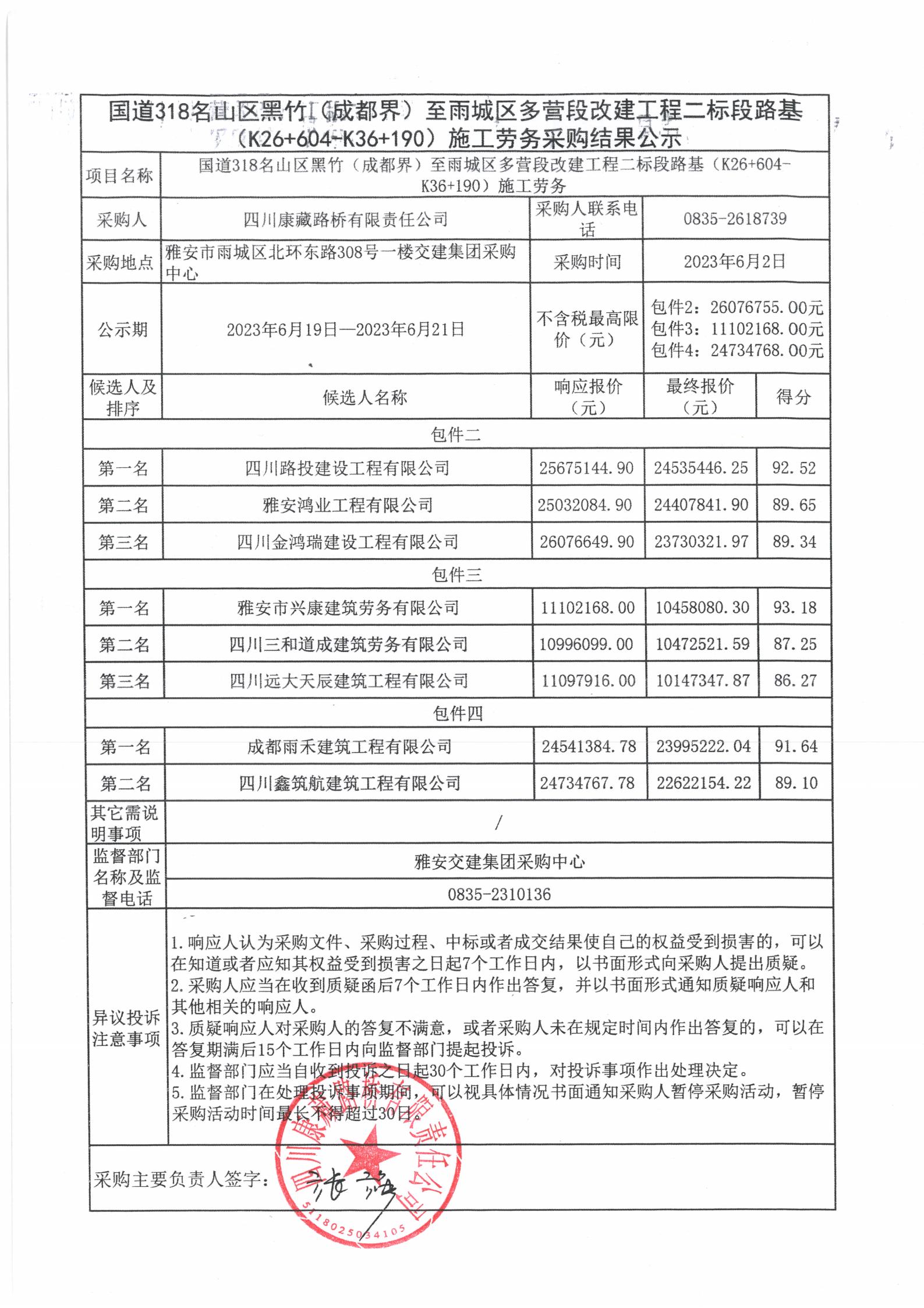 四川康藏路橋有限責任公司國道318名山區(qū)黑竹(成都界)至雨城區(qū)多營段改建工程二標段路基(K26+604-K36+190)施工勞務采購(包件二、包件三、包件四)結果公示