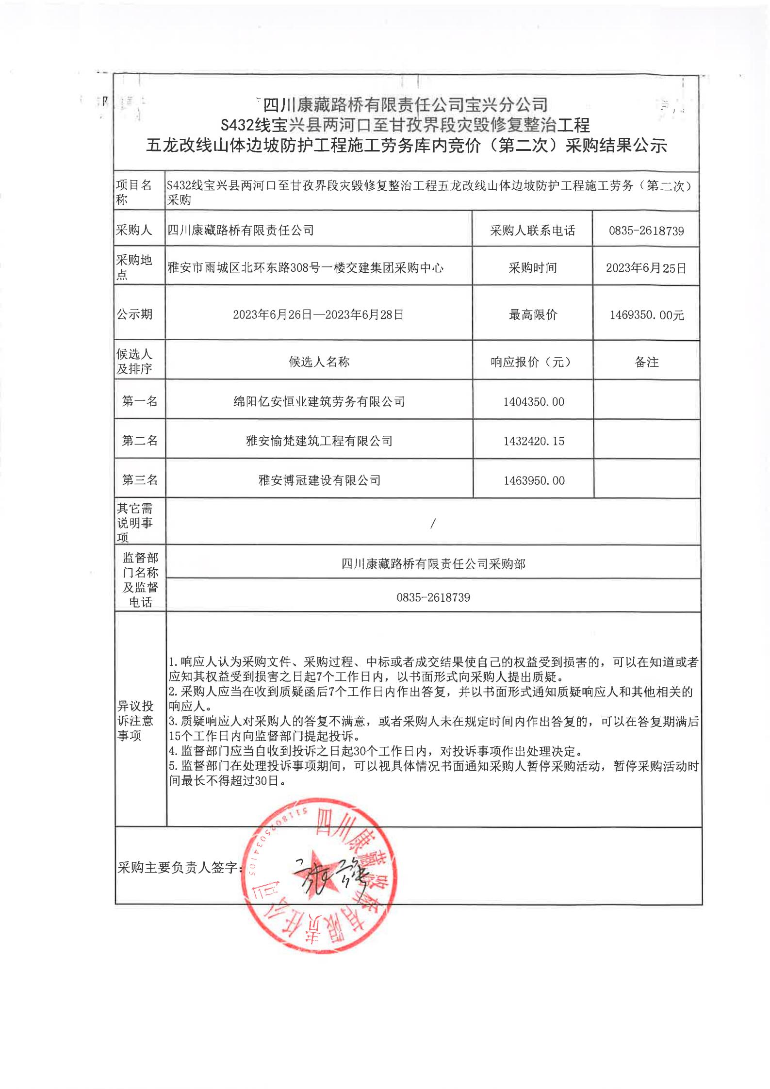 四川康藏路橋有限責(zé)任公司寶興分公司S432寶興縣兩河口至甘孜界段災(zāi)毀修復(fù)整治工程五龍改線山體邊坡防護(hù)工程施工勞務(wù)庫(kù)內(nèi)競(jìng)價(jià)(第二次)結(jié)果公示