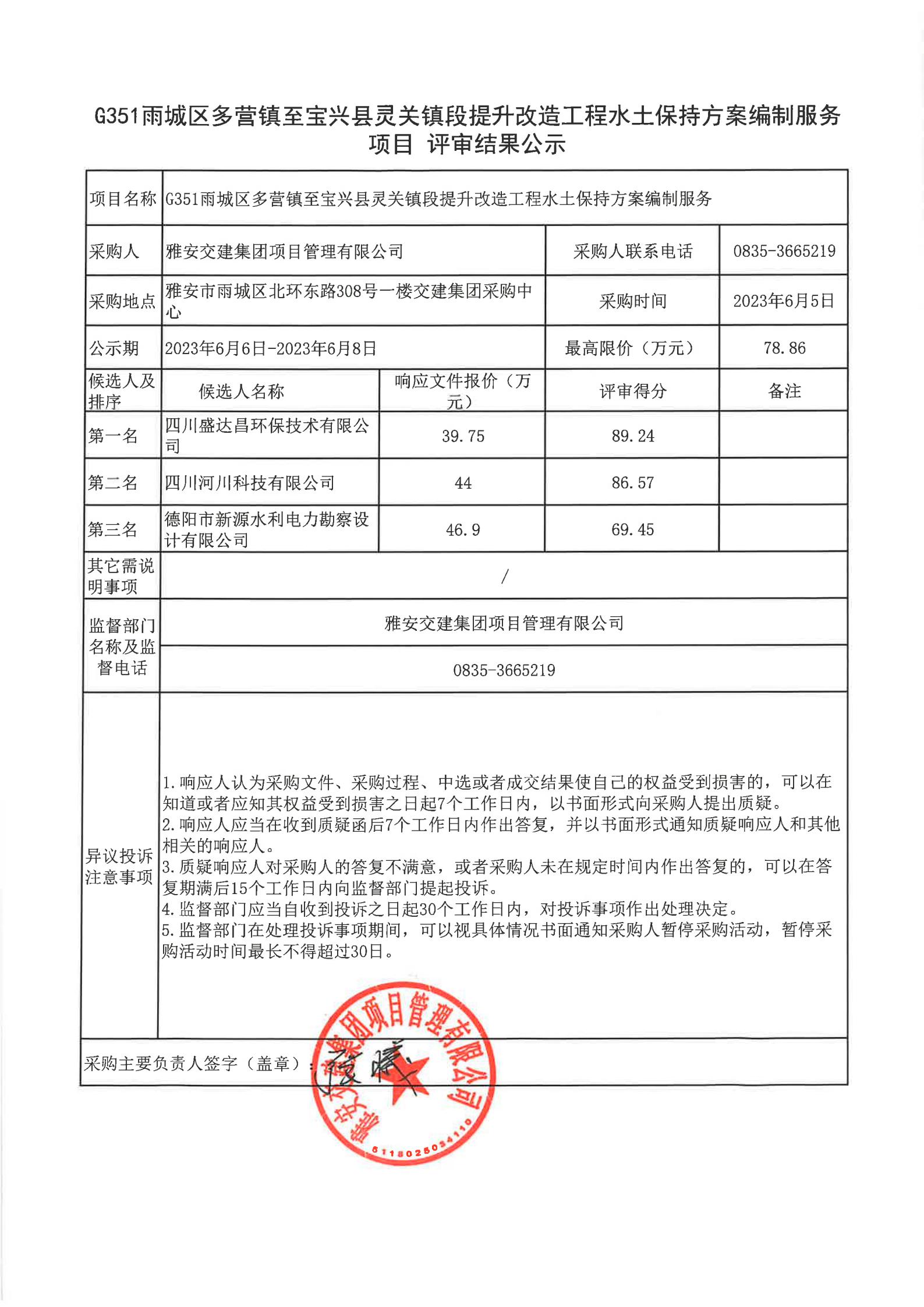 雅安交建集團項目管理有限公司G351雨城區(qū)多營鎮(zhèn)至寶興縣靈關鎮(zhèn)段提升改造工程水土保持方案編制服務項目評審結(jié)果公示
