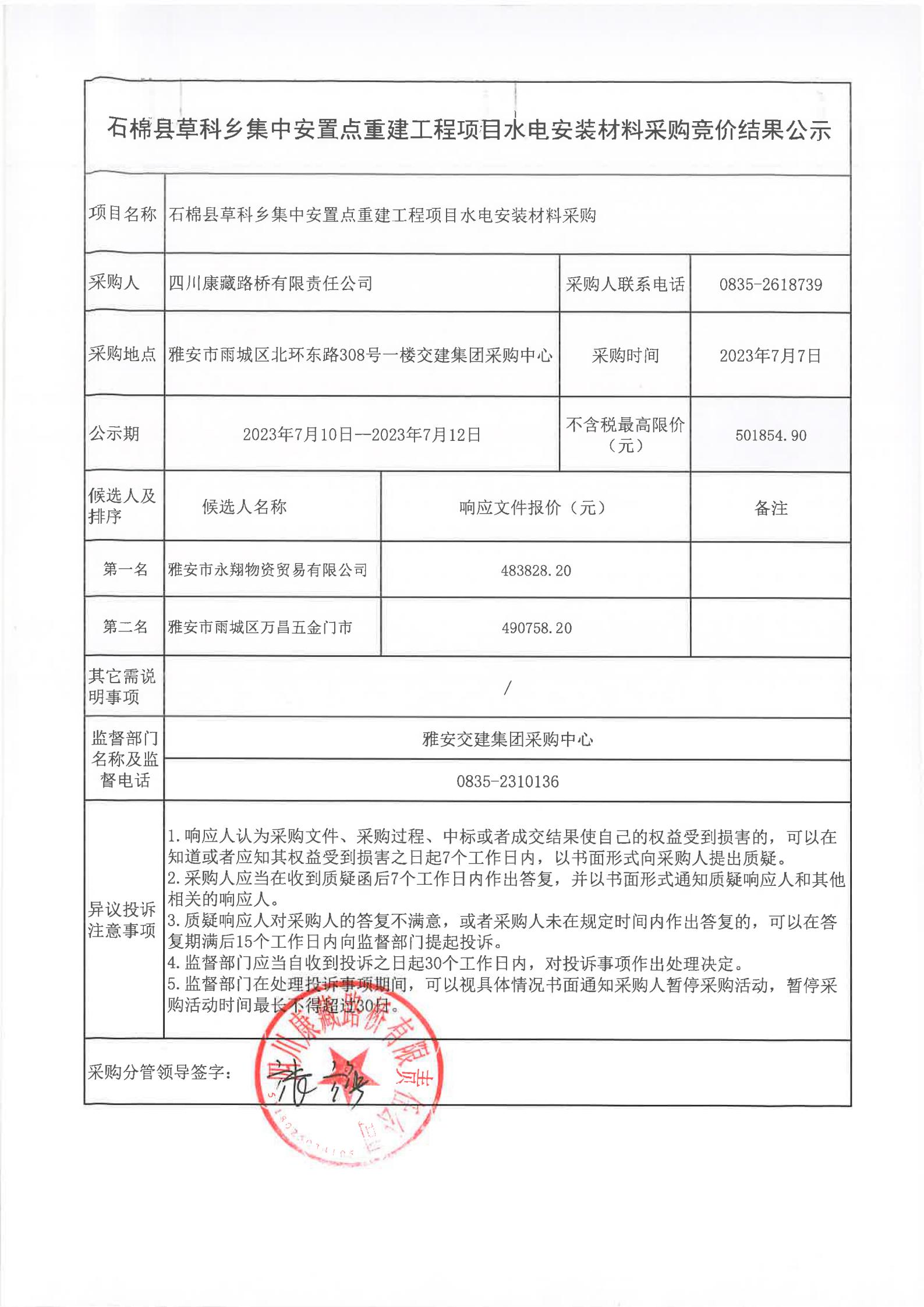 四川康藏路橋有限責(zé)任公司石棉草科鄉(xiāng)集中安置點(diǎn)重建工程項(xiàng)目水電安裝材料采購競價(jià)結(jié)果公示