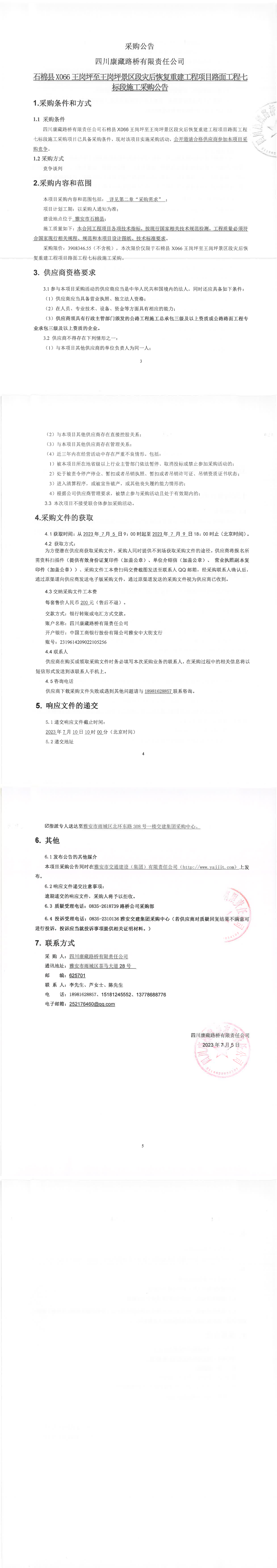 四川康藏路橋有限責(zé)任公司石棉縣X66X王崗坪景區(qū)段災(zāi)后恢復(fù)重建工程項(xiàng)目路面工程七標(biāo)段施工采購(gòu)公告