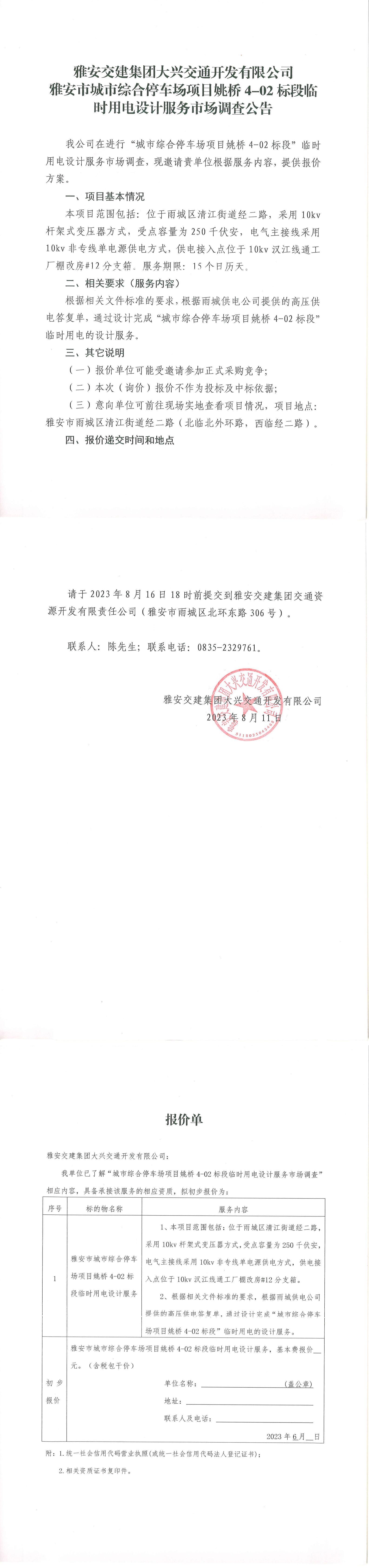 雅安交建集團(tuán)大興交通開發(fā)有限公司雅安市城市綜合停車場項(xiàng)目姚橋4-02標(biāo)段臨時用電設(shè)計(jì)服務(wù)市場調(diào)查公告