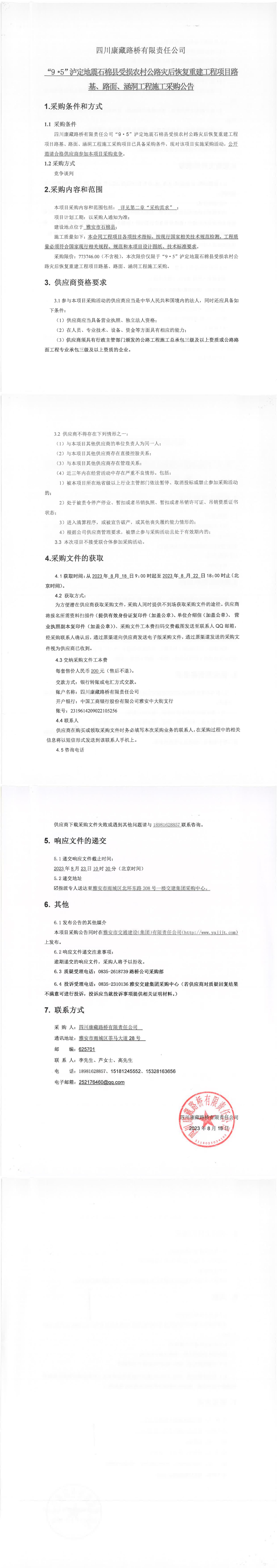 四川康藏路橋有限責任公司“9·5”瀘定地震石棉縣受損農(nóng)村公路災后恢復重建工程項目路基、路面、涵洞工程施工采購公告