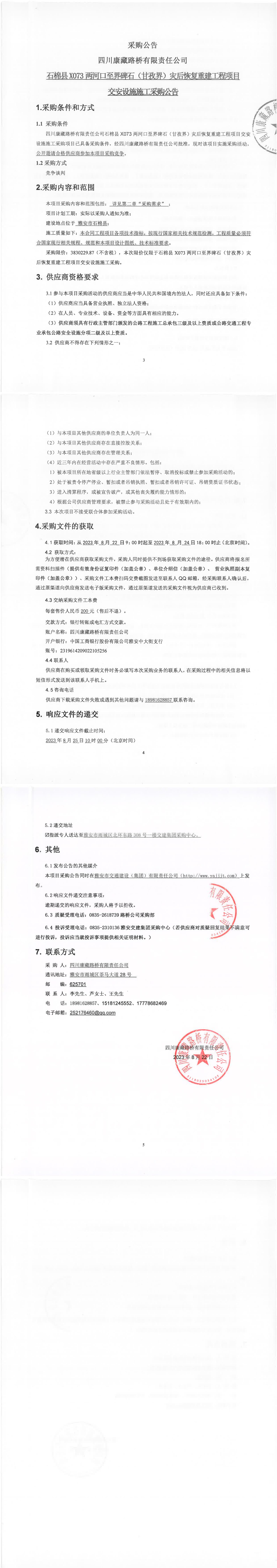 四川康藏路橋有限責(zé)任公司石棉縣X073兩河口至界碑石(甘孜界)災(zāi)后恢復(fù)重建工程項(xiàng)目交安設(shè)施施工采購公告