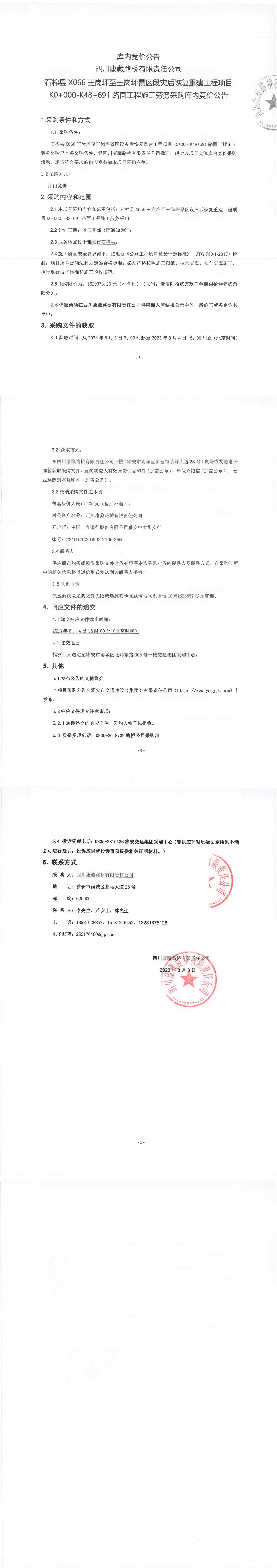 四川康藏路橋有限責任公司石棉縣X066王崗坪至王崗坪景區(qū)段災后恢復重建工程項目K0+000-K48+691路面工程施工勞務采購庫內競價公告
