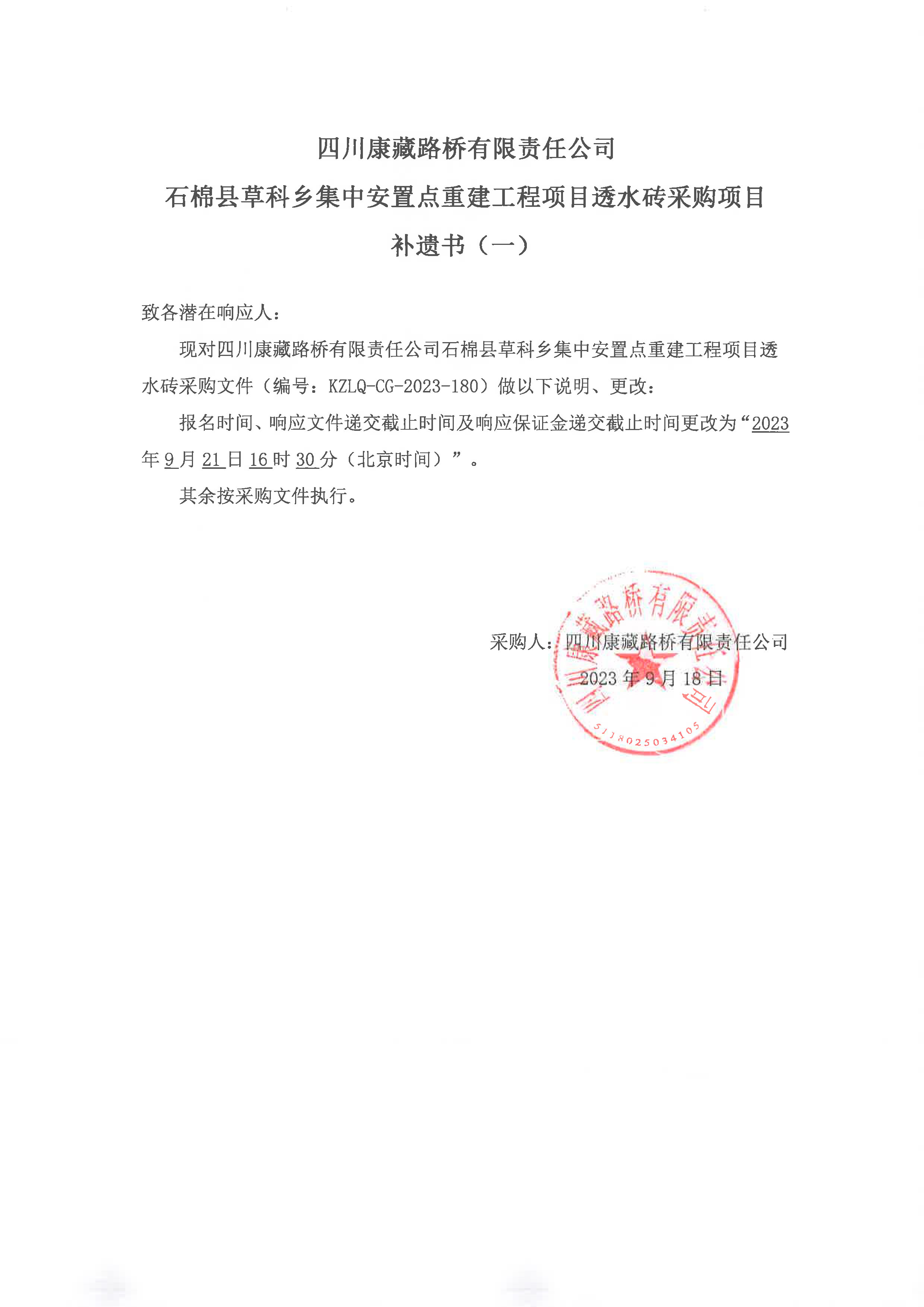 四川康藏路橋有限責(zé)任公司石棉縣草科鄉(xiāng)集中安置點(diǎn)重建工程項(xiàng)目透水磚采購(gòu)項(xiàng)目補(bǔ)遺書(一)