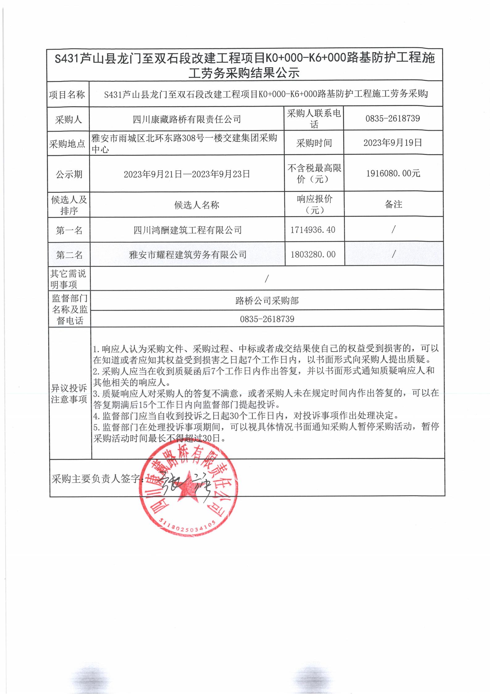 四川康藏路橋有限責(zé)任公司S431蘆山縣龍門(mén)至雙石段改建工程項(xiàng)目K0+000-K6+000路基防護(hù)工程施工勞務(wù)采購(gòu)結(jié)果公示
