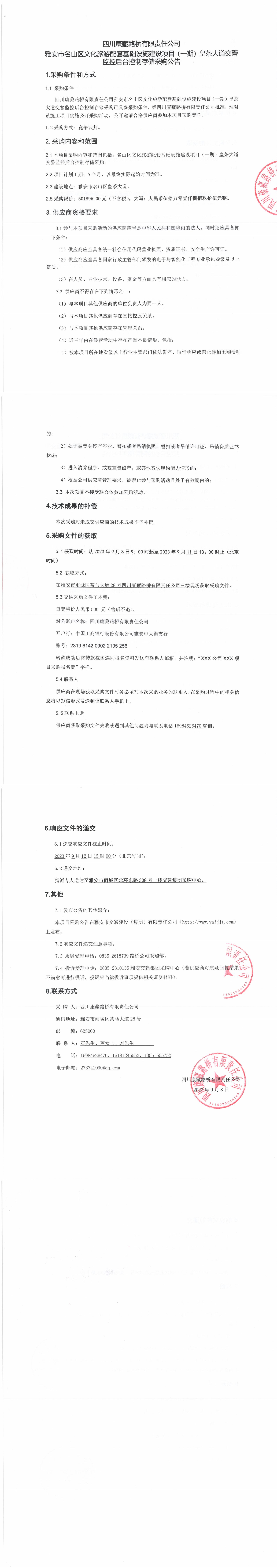 四川康藏路橋有限責任公司雅安市名山區(qū)文化旅游配套基礎(chǔ)設(shè)施建設(shè)項目(一期)皇茶大道交警監(jiān)控后臺控制存儲采購公告