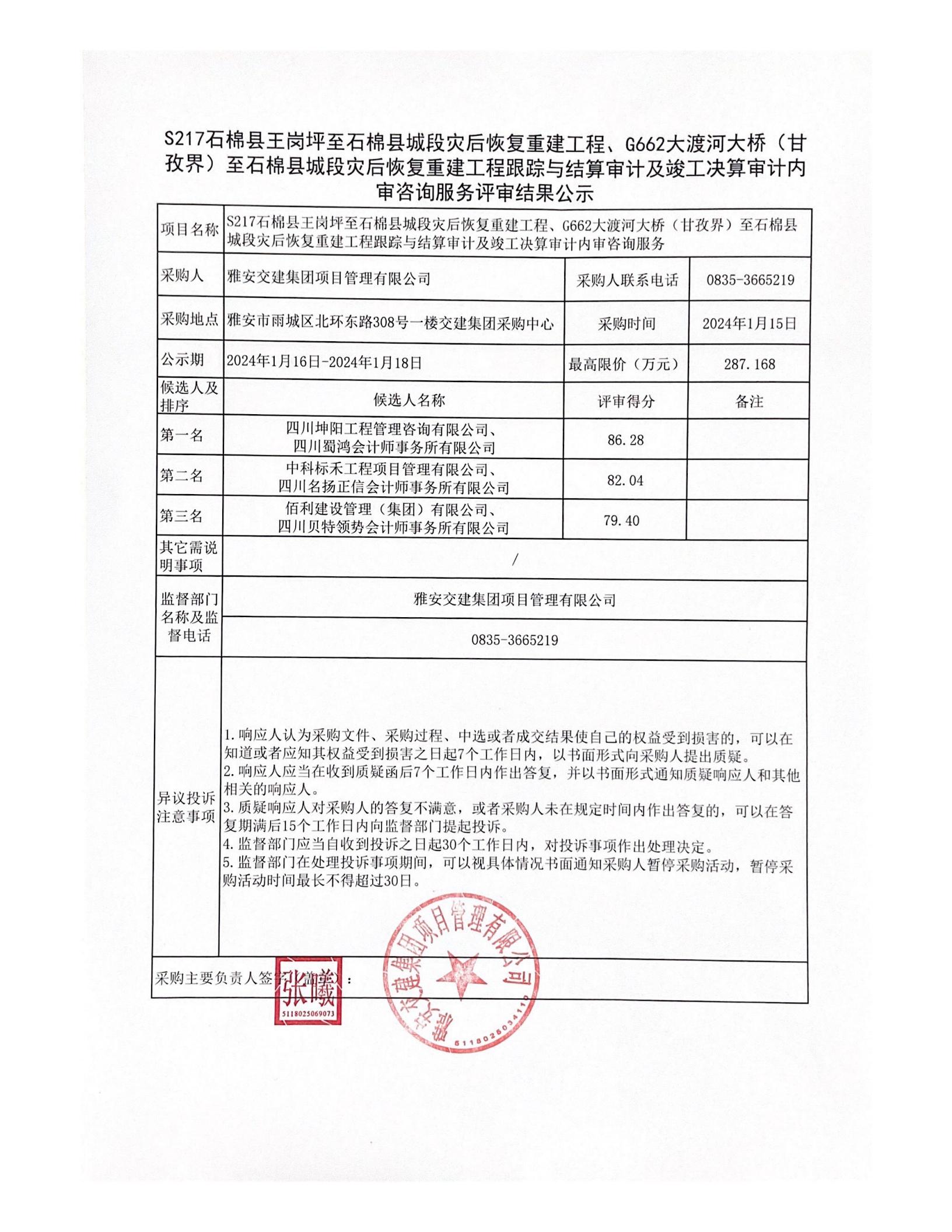 雅安交建集團項目管理有限公司S217石棉縣王崗坪至石棉縣城段災后恢復重建工程、G662大渡河大橋(甘孜界)至石棉縣城段災后恢復重建工程跟蹤與結算審計及竣工決算審計內審咨詢服務評審結果公示