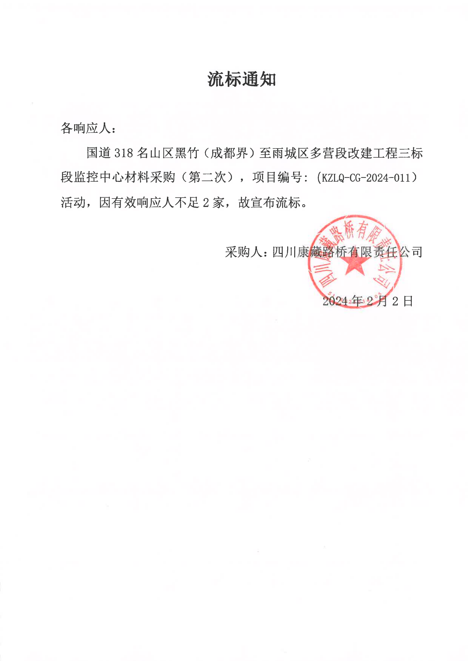 四川康藏路橋有限責(zé)任公司國(guó)道318名山區(qū)黑竹(成都界)至雨城區(qū)多營(yíng)段改建工程三標(biāo)段監(jiān)控中心材料采購(第二次)流標(biāo)通知