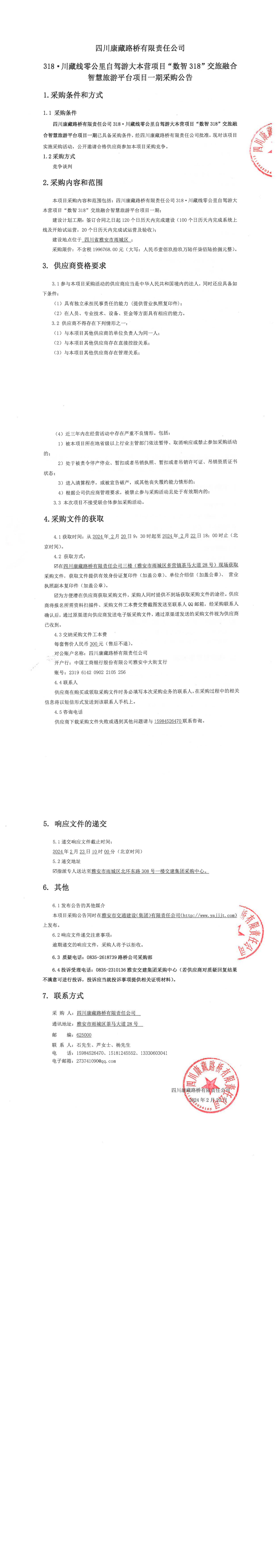 四川康藏路橋有限責(zé)任公司318·川藏線零公里自駕游大本營項(xiàng)目“數(shù)智318”交旅融合智慧旅游平臺項(xiàng)目一期采購公告