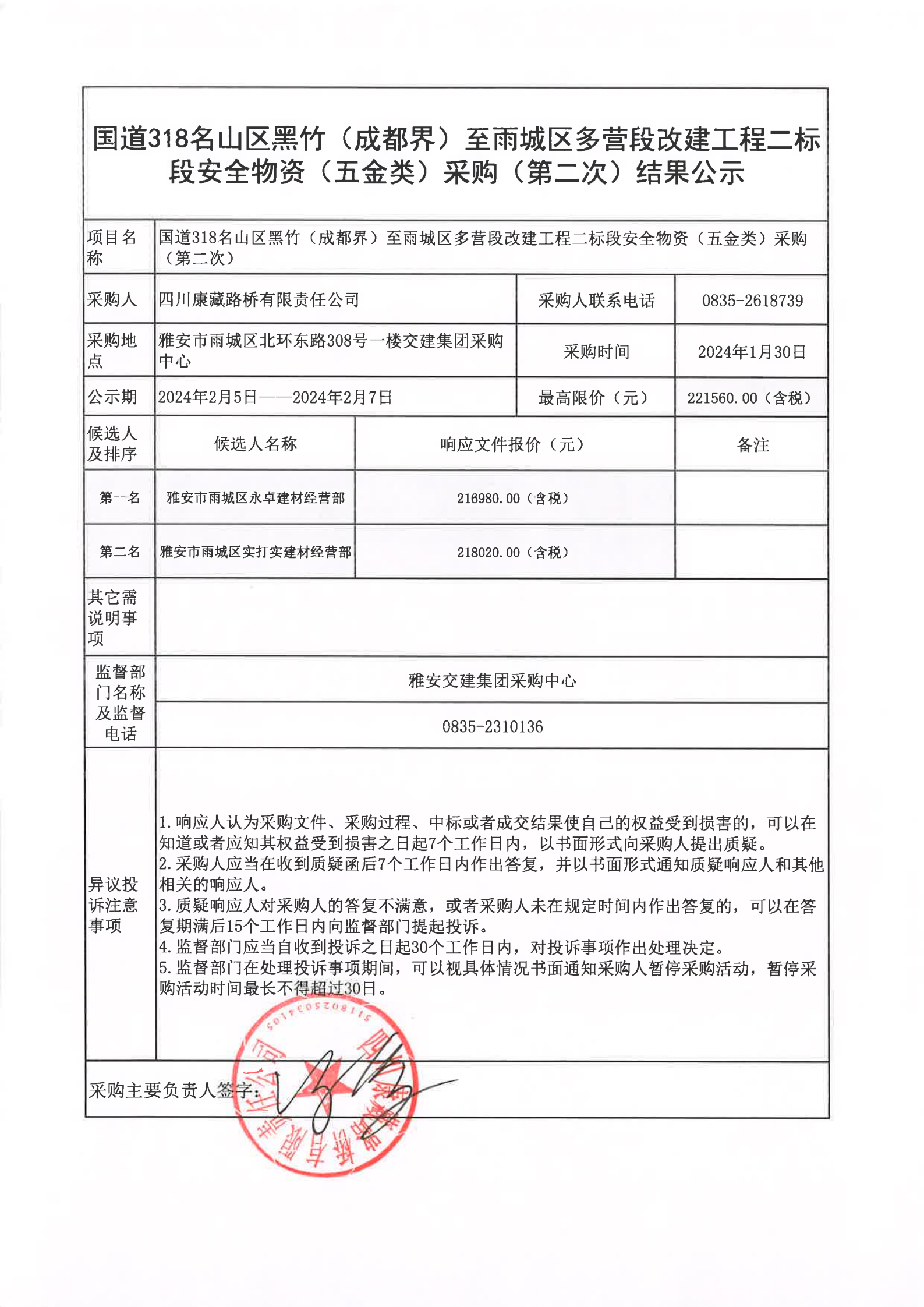 四川康藏路橋有限責任公司國道318名山區(qū)黑竹(成都界)至雨城區(qū)多營段改建工程二標段安全物資(五金類)采購(第二次)結果公示