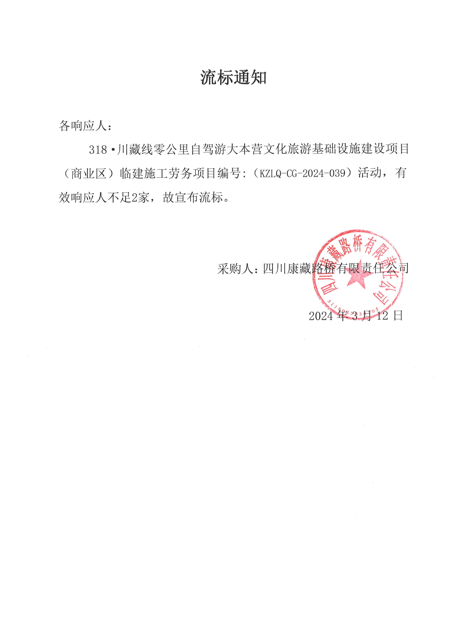 四川康藏路橋有限責任公司318·川藏線零公里自駕游大本營文化旅游基礎設施建設項目(商業(yè)區(qū))臨建施工勞務流標通知