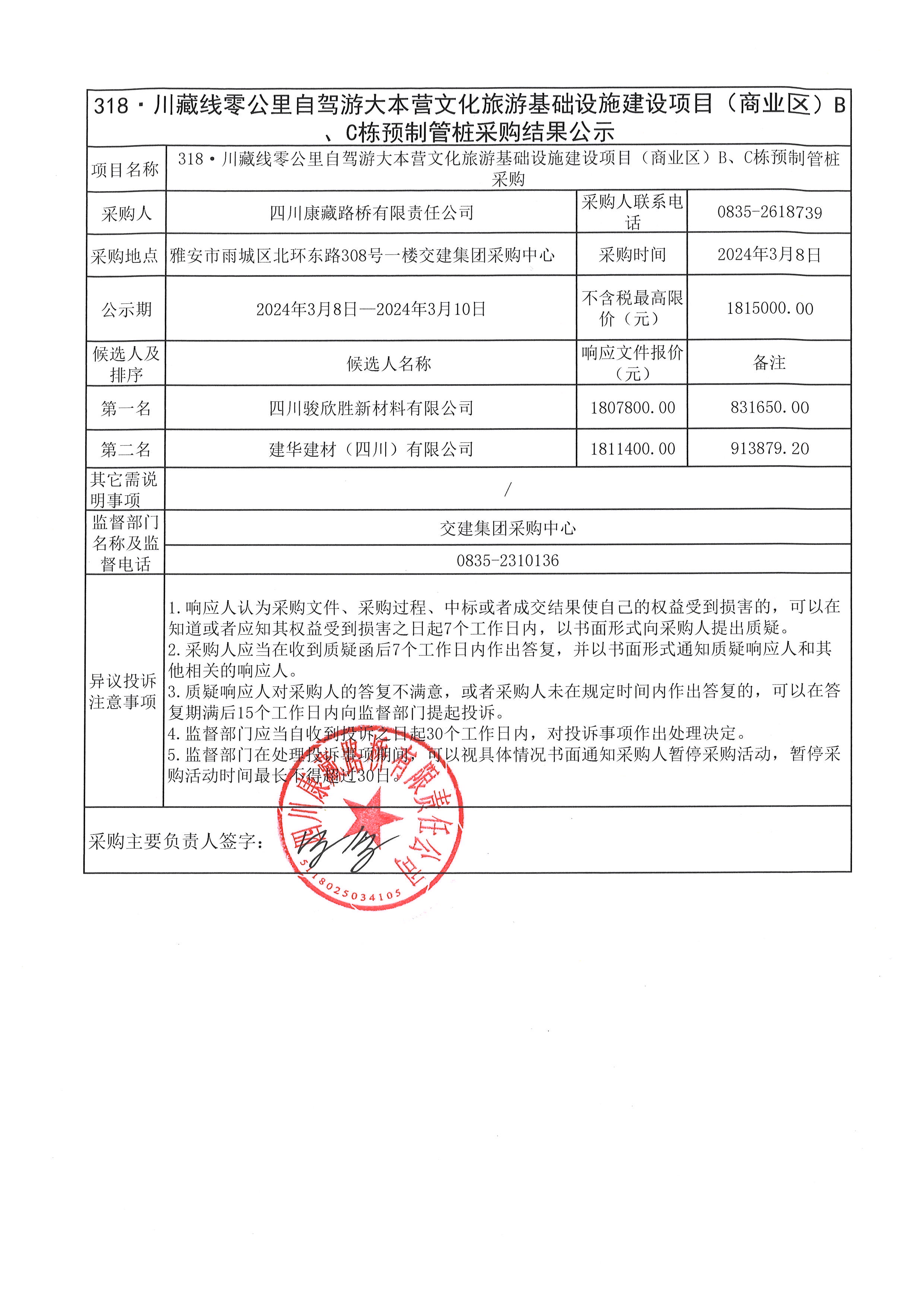 四川康藏路橋有限責(zé)任公司318·川藏線零公里自駕游大本營(yíng)文化旅游基礎(chǔ)設(shè)施建設(shè)項(xiàng)目(商業(yè)區(qū))B、C棟預(yù)制管樁采購(gòu)結(jié)果公示