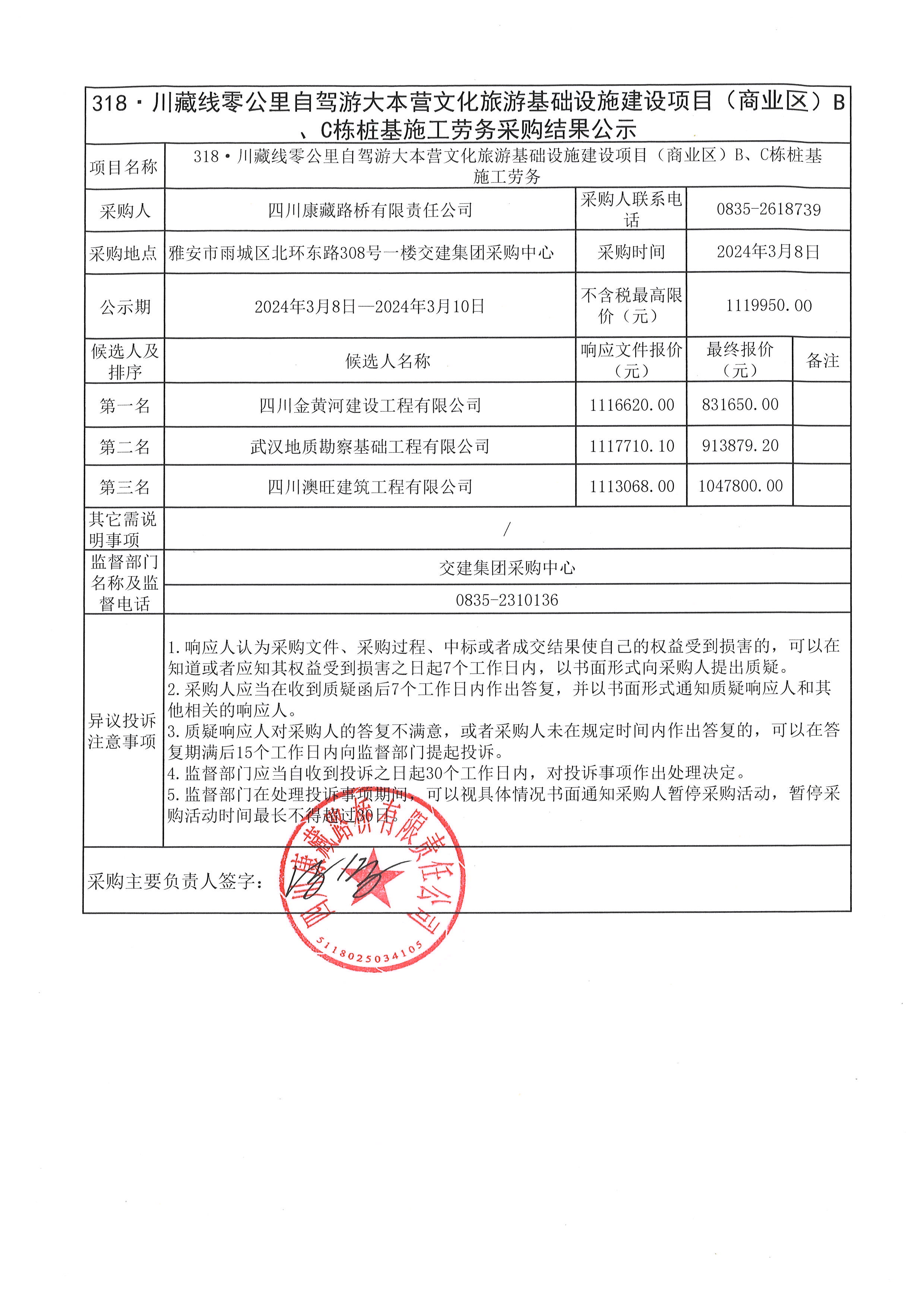 四川康藏路橋有限責(zé)任公司318·川藏線零公里自駕游大本營(yíng)文化旅游基礎(chǔ)設(shè)施建設(shè)項(xiàng)目(商業(yè)區(qū))B、C棟預(yù)制管樁采購(gòu)結(jié)果公示