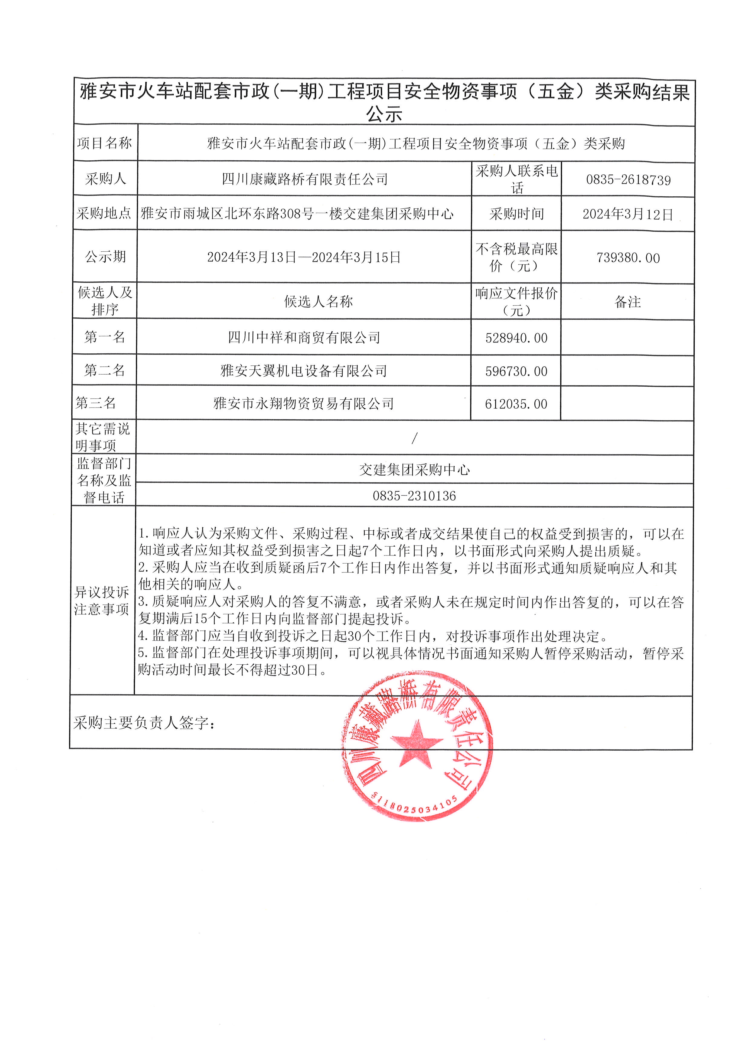 四川康藏路橋有限責(zé)任公司雅安市火車站配套市政(一期)工程項(xiàng)目安全物資(五金)采購結(jié)果公示
