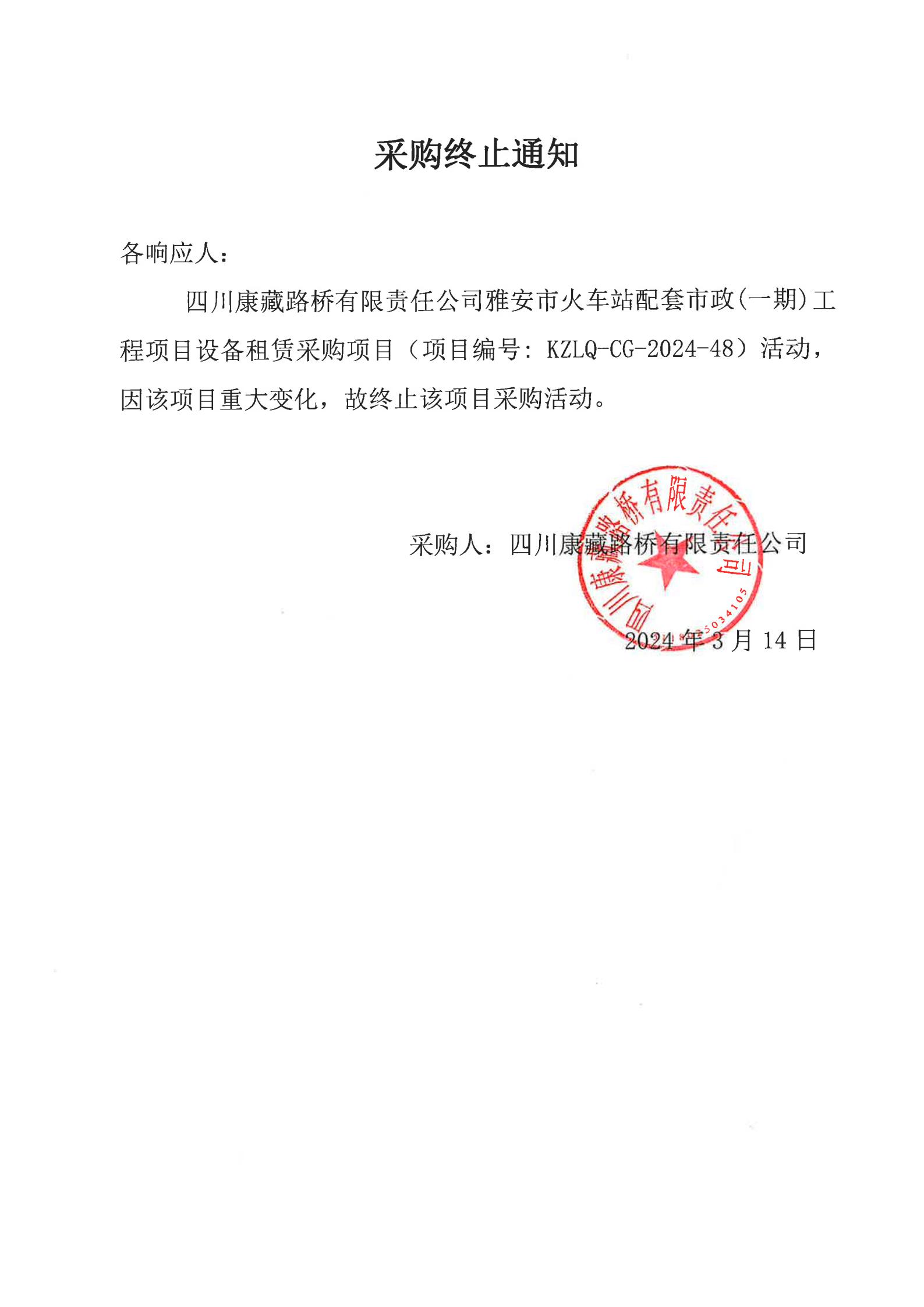 四川康藏路橋有限責(zé)任公司雅安市火車站配套市政(一期)工程項(xiàng)目設(shè)備租賃采購終止通知