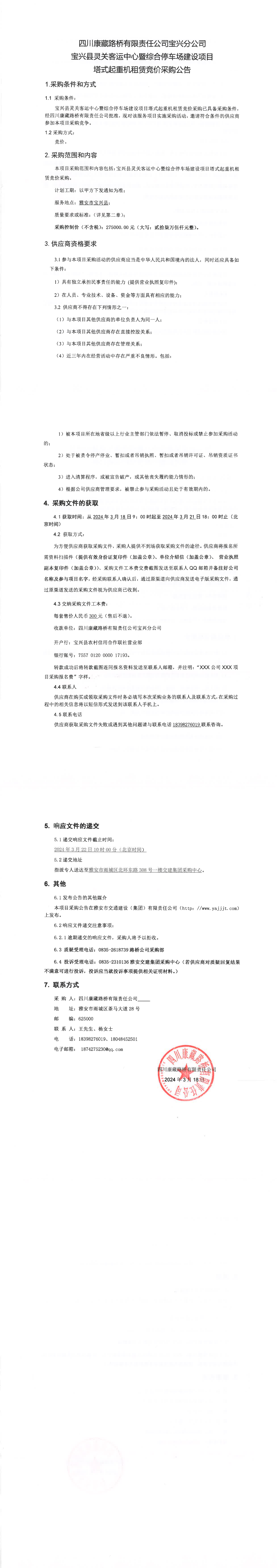 四川康藏路橋有限責任公司寶興縣靈關客運中心暨綜合停車場建設項目塔式起重機租賃競價采購公告