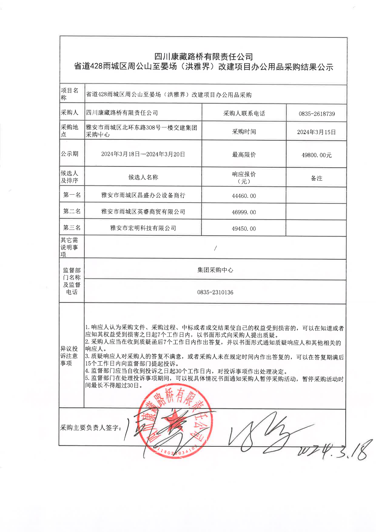 四川康藏路橋有限責(zé)任公司省道428雨城區(qū)周公山至晏場(洪雅界)改建項目辦公用品(第二次)采購結(jié)果公示