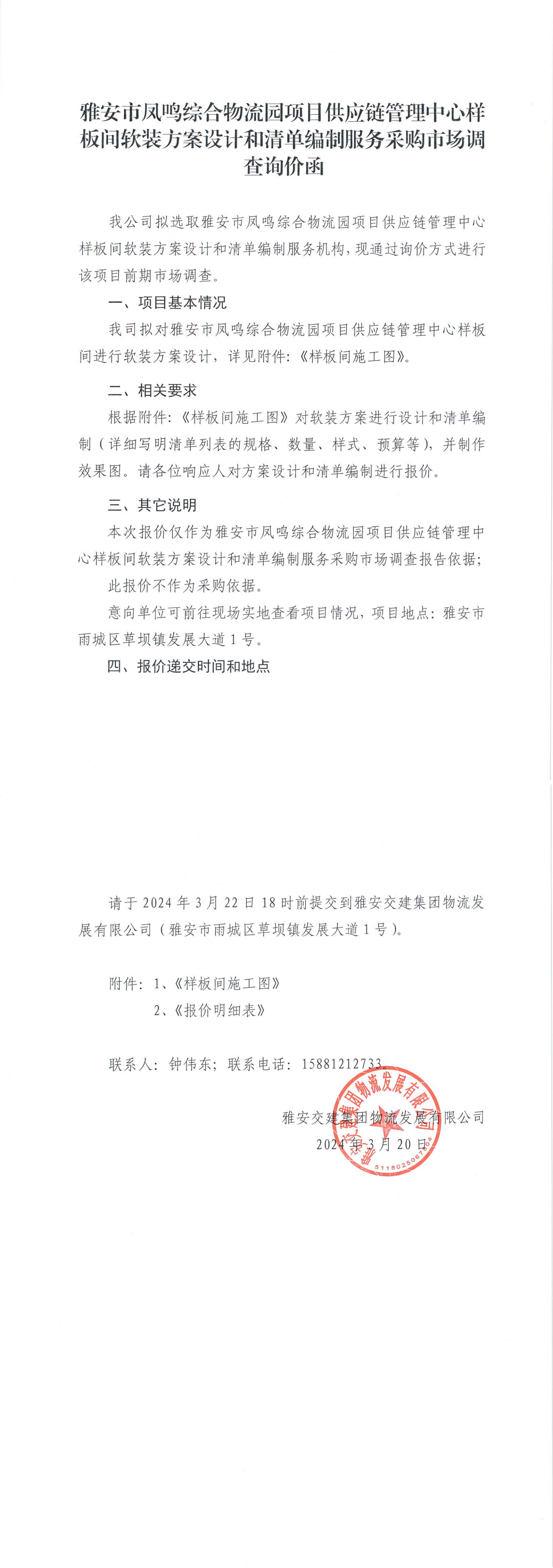 雅安交建集團(tuán)物流發(fā)展有限公司雅安市鳳鳴綜合物流園項(xiàng)目供應(yīng)鏈管理中心樣板間軟裝方案設(shè)計(jì)和清單編制服務(wù)采購(gòu)市場(chǎng)調(diào)查詢價(jià)函