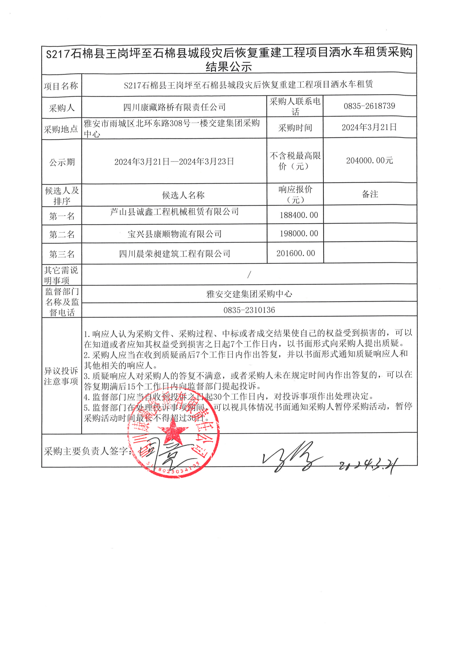 四川康藏路橋有限責(zé)任公司S217石棉縣王崗坪至石棉縣城段災(zāi)后恢復(fù)重建工程項(xiàng)目灑水車租賃采購(gòu)結(jié)果公示
