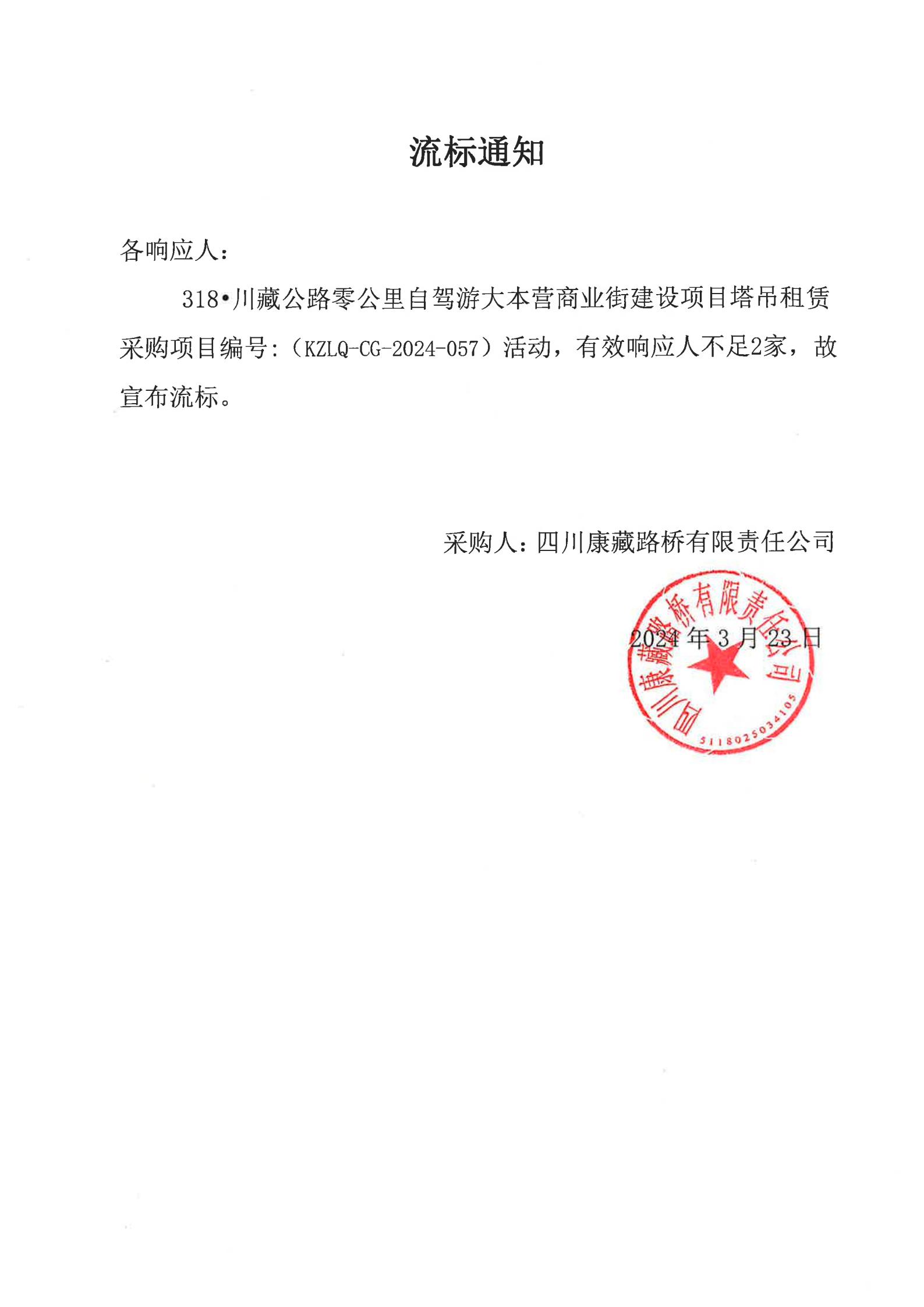 四川康藏路橋有限責任公司318•川藏公路零公里自駕游大本營商業(yè)街建設項目塔吊租賃采購流標通知