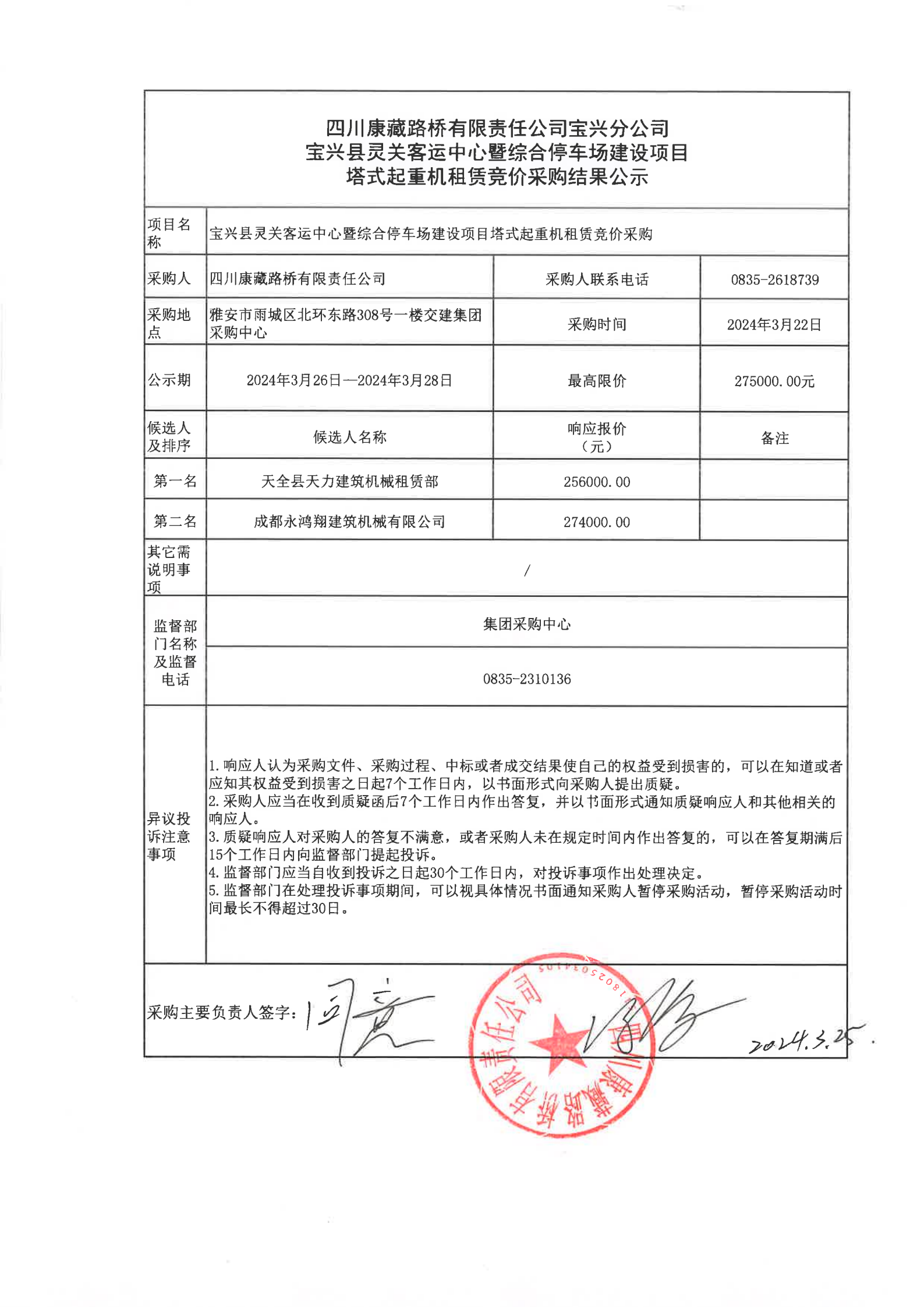四川康藏路橋有限責任公司寶興縣靈關(guān)客運中心暨綜合停車場建設(shè)項目塔式起重機租賃競價采購結(jié)果公示