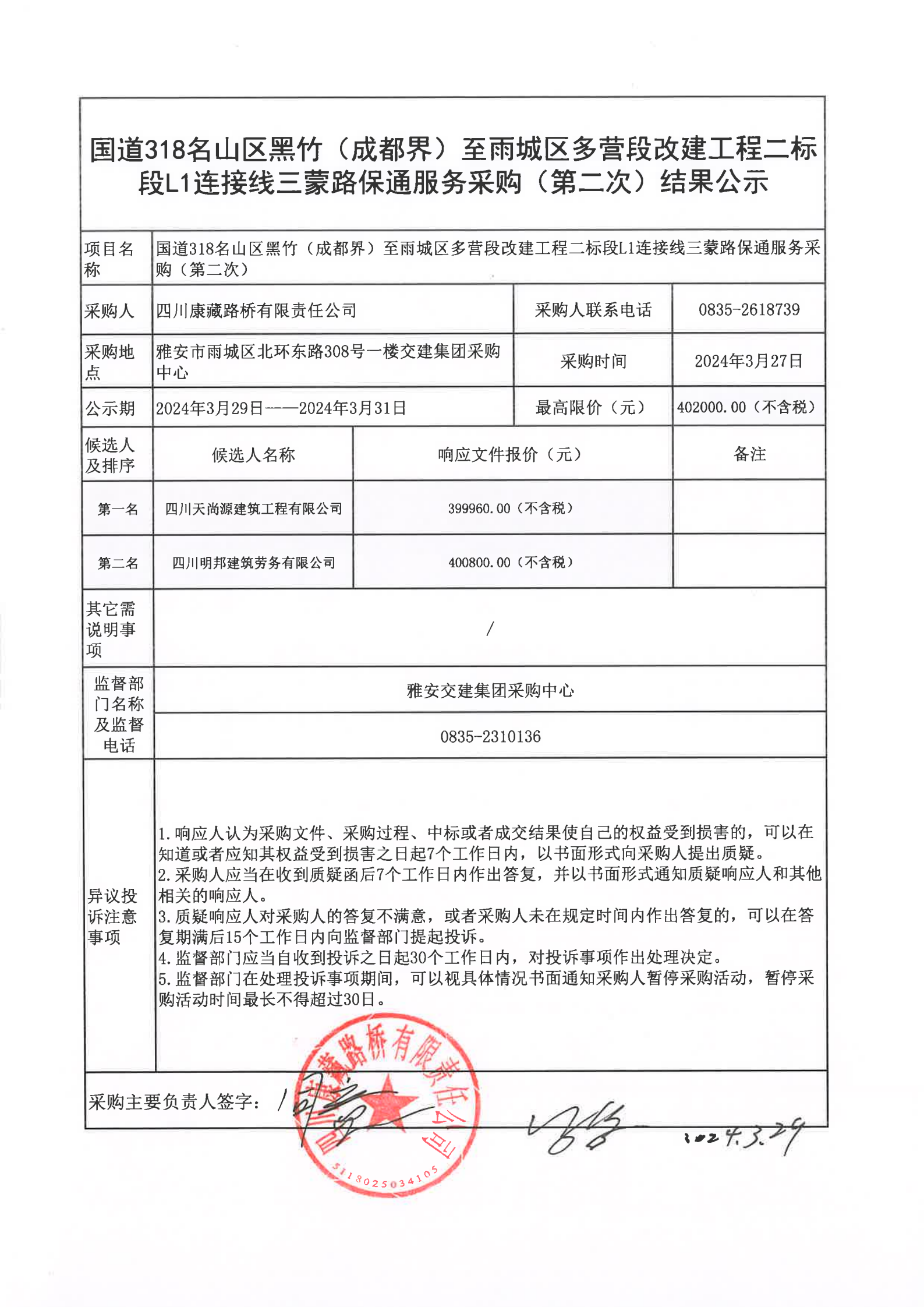 四川康藏路橋有限責任公司國道318名山區(qū)黑竹(成都界)至雨城區(qū)多營段改建工程二標段L1連接線三蒙路保通服務(wù)(第二次)結(jié)果公示