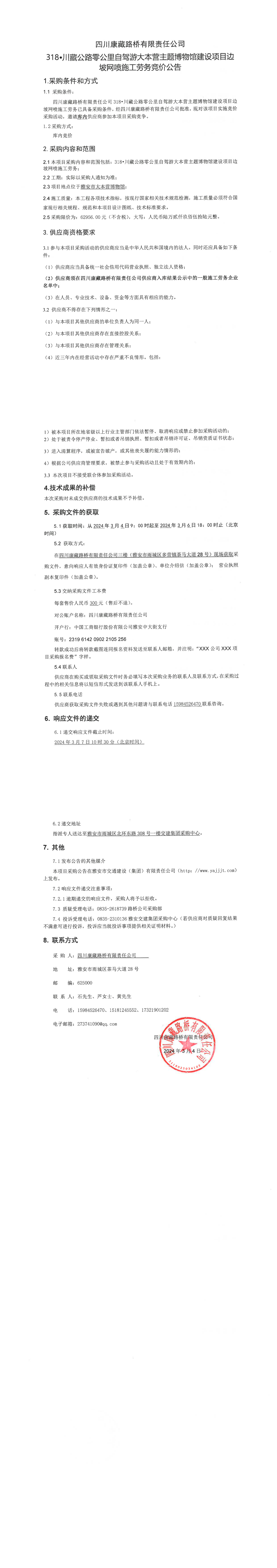 四川康藏路橋有限責(zé)任公司318·川藏公路零公里自駕游大本營主題博物館建設(shè)項目邊坡網(wǎng)噴施工勞務(wù)競價公告