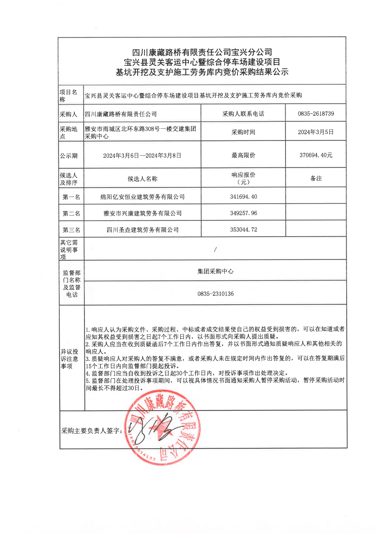 四川康藏路橋有限責(zé)任公司寶興縣靈關(guān)客運(yùn)站中心暨綜合停車場建設(shè)項(xiàng)目基坑降水施工勞務(wù)庫內(nèi)競價(jià)采購結(jié)果公示