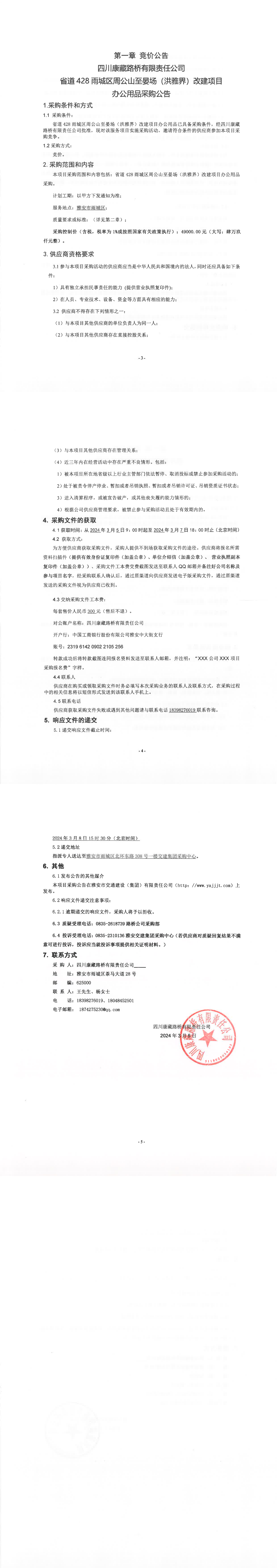 四川康藏路橋有限責(zé)任公司省道428雨城區(qū)周公山至晏場(chǎng)(洪雅界)改建項(xiàng)目辦公用品采購(gòu)公告