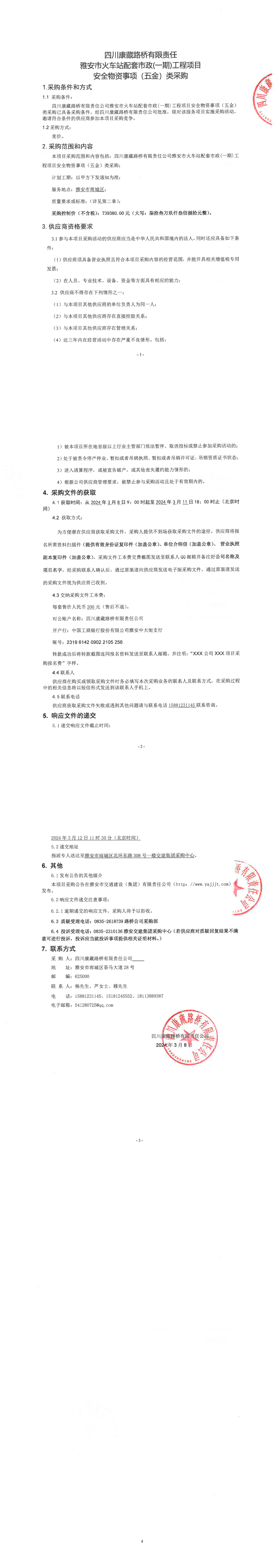 四川康藏路橋有限責(zé)任公司雅安市火車站配套市政(一期)工程項(xiàng)目安全物資事項(xiàng)(五金)類采購(gòu)公告