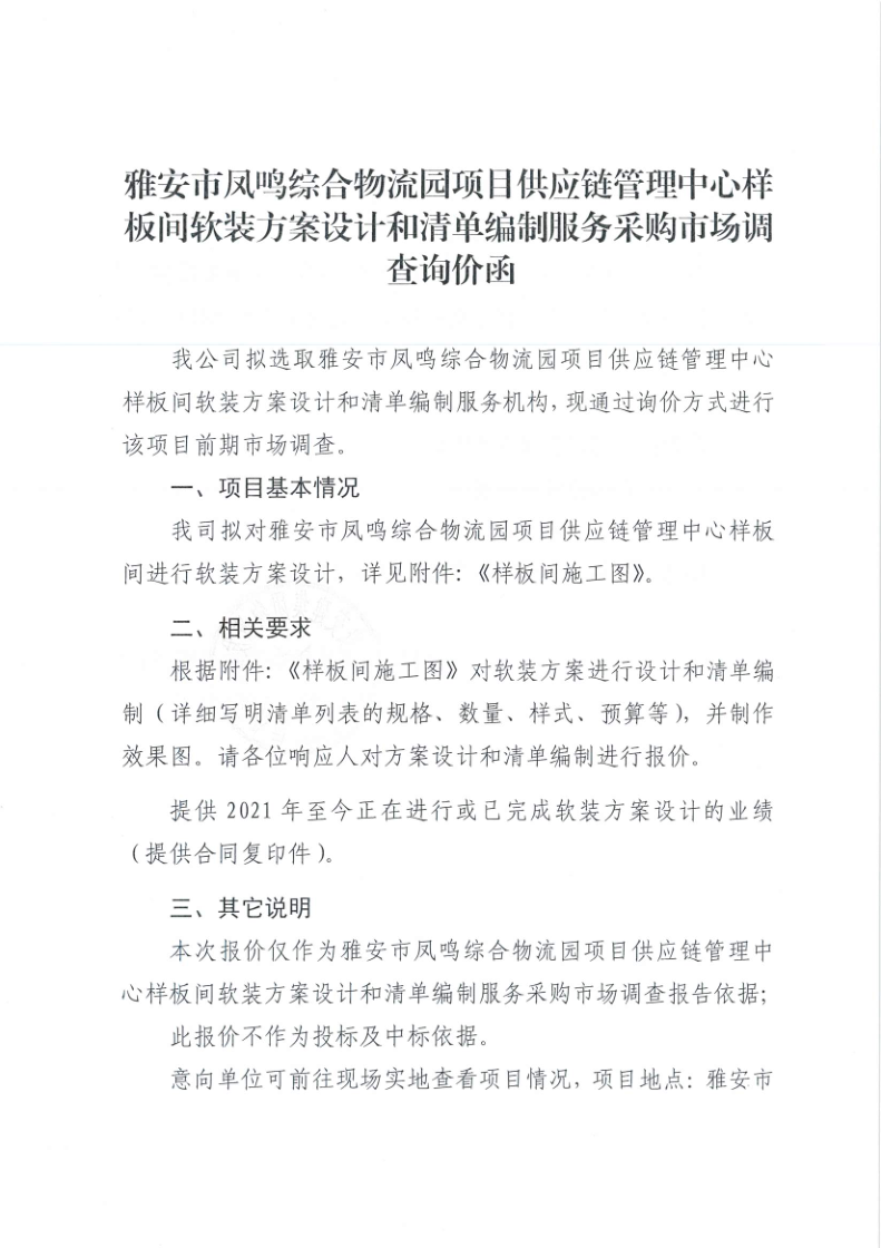 雅安交建集團(tuán)物流發(fā)展有限公司雅安市鳳鳴綜合物流園項(xiàng)目供應(yīng)鏈管理中心樣板間軟裝方案設(shè)計(jì)和清單編制服務(wù)采購(gòu)市場(chǎng)調(diào)查詢(xún)價(jià)函