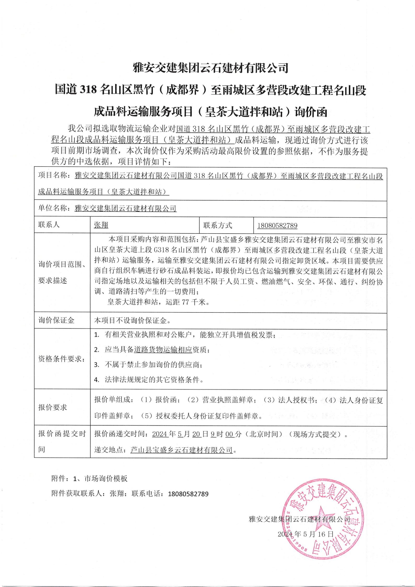 雅安交建集團(tuán)云石建材有限公司國道318名山區(qū)黑竹(成都界)至雨城區(qū)多營段改建工程名山段成品料運(yùn)輸服務(wù)項目(皇茶大道拌和站)詢價函