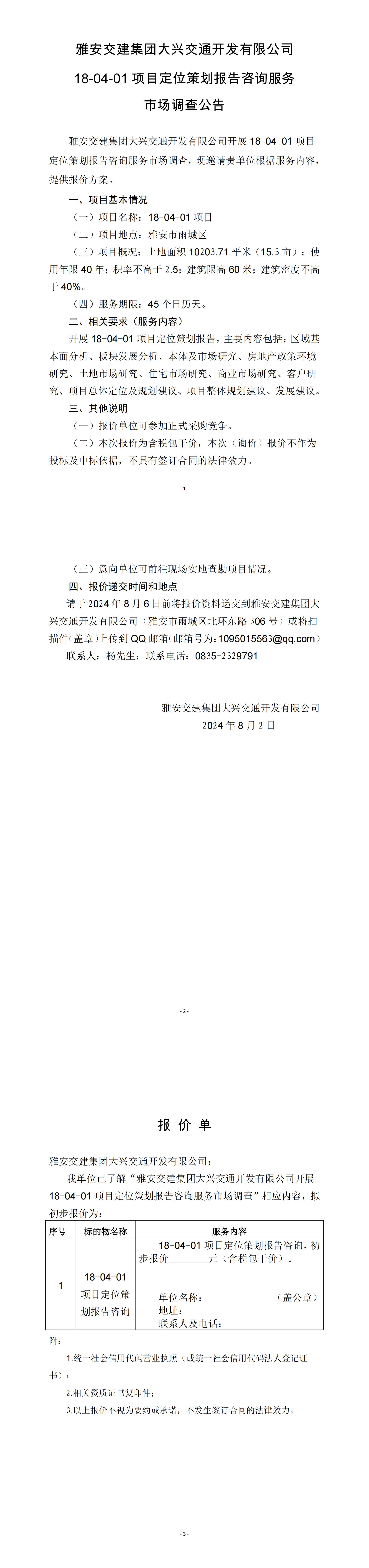 雅安交建集團大興交通開發(fā)有限公司18-04-01項目定位策劃報告咨詢服務市場調(diào)查公告