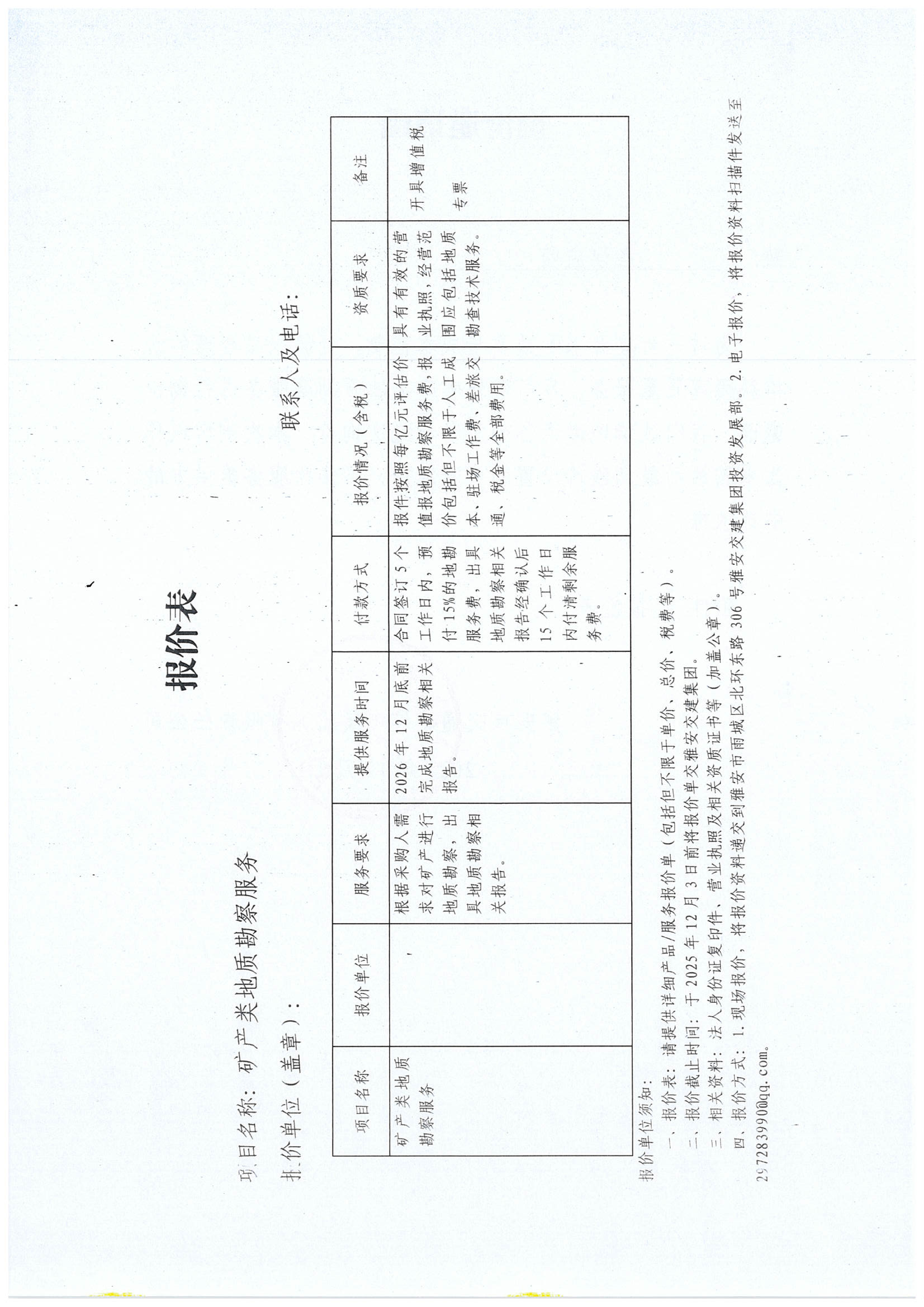 關(guān)于雅安市交通建設(shè)(集團(tuán))有限責(zé)任公司礦產(chǎn)類地質(zhì)勘察服務(wù)限價(jià)的詢價(jià)函