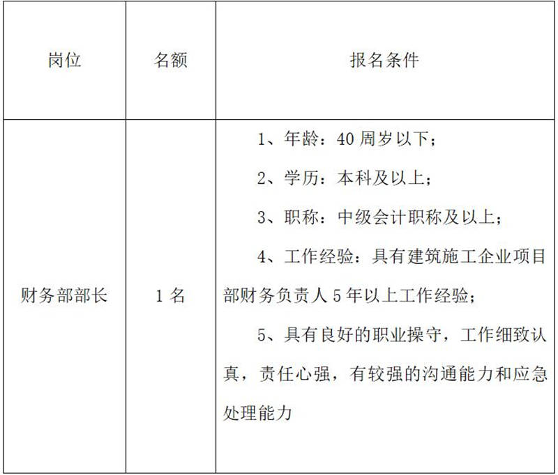 雅安交建集團路橋有限責(zé)任公司是雅安市交通建設(shè)(集團)有限責(zé)任公司下屬子公司,主要從事道路、橋梁修建,F(xiàn)根據(jù)公司業(yè)務(wù)發(fā)展需要,擬向社會公開招聘1名財務(wù)部部長,現(xiàn)將有關(guān)事項公告如下:
