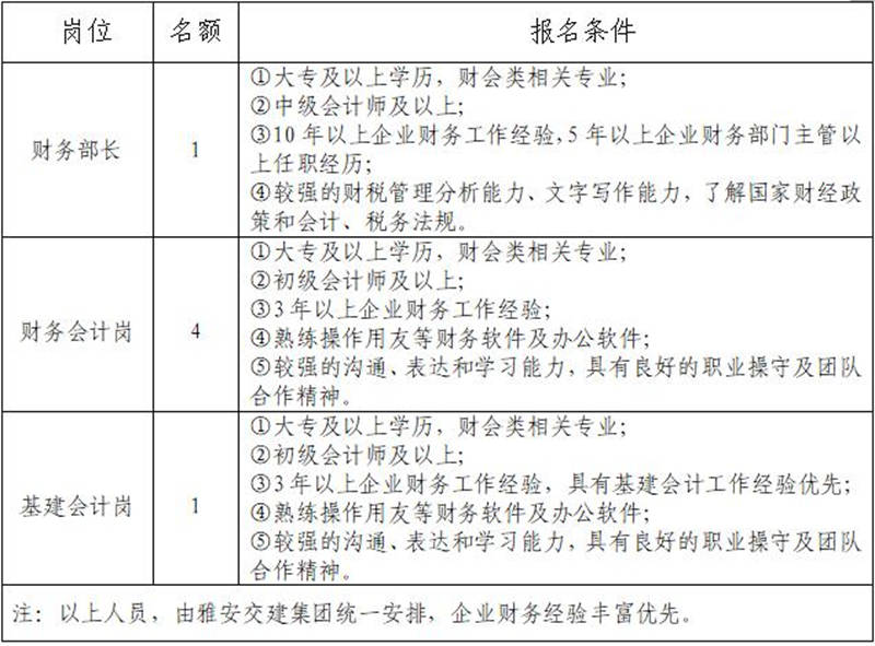 根據(jù)發(fā)展需要,決定面向社會公開招聘雅安市交通建設(shè)(集團(tuán))有限責(zé)任公司(以下簡稱“雅安交建集團(tuán)”)所屬子公司財(cái)務(wù)部門負(fù)責(zé)人1名,工作人員5名,現(xiàn)將有關(guān)事項(xiàng)公告如下: