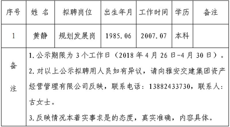 雅安交建集團(tuán)資產(chǎn)經(jīng)營管理有限公司擬聘用人員公示